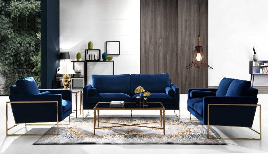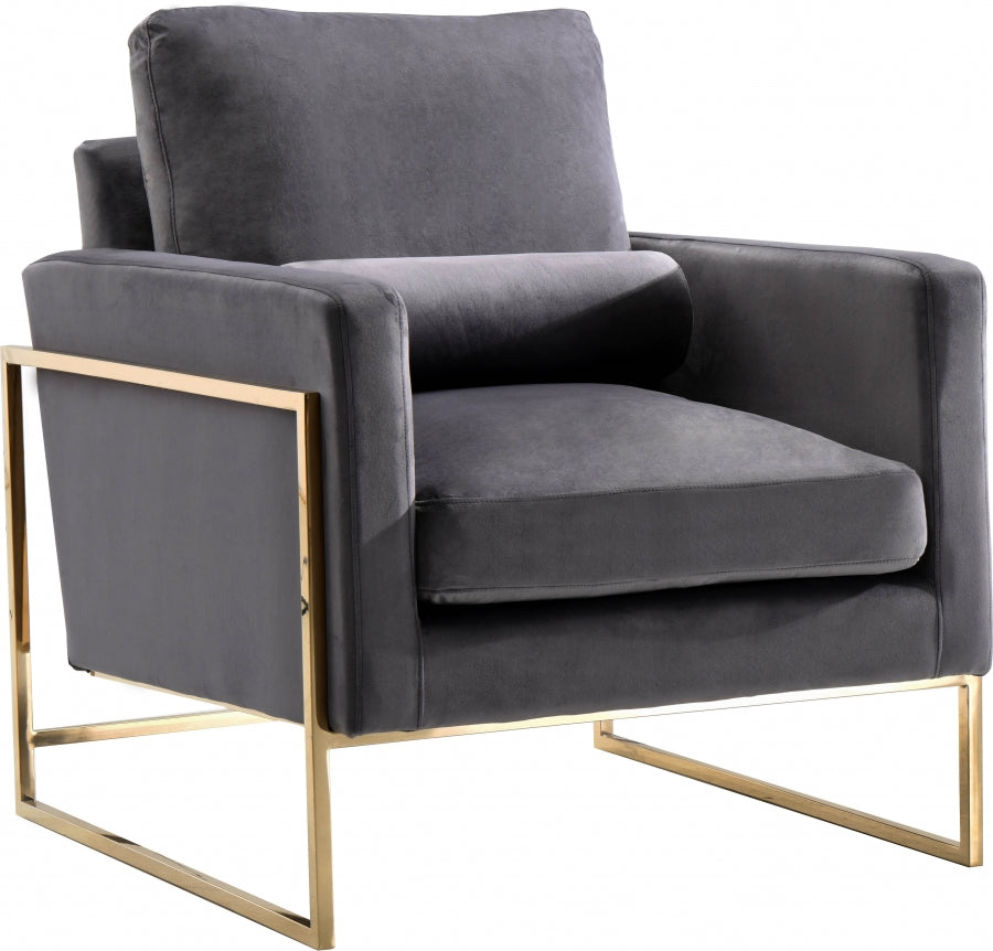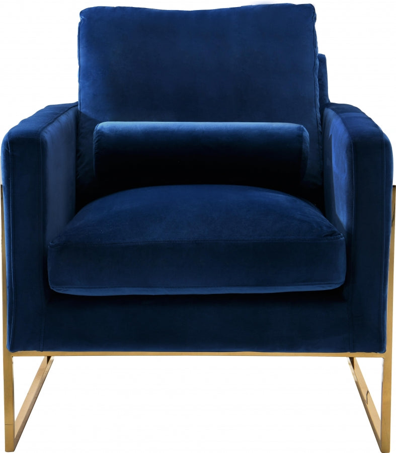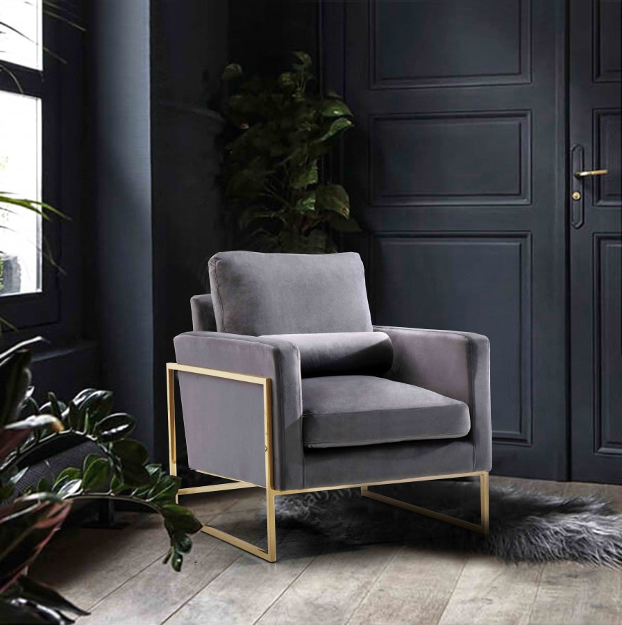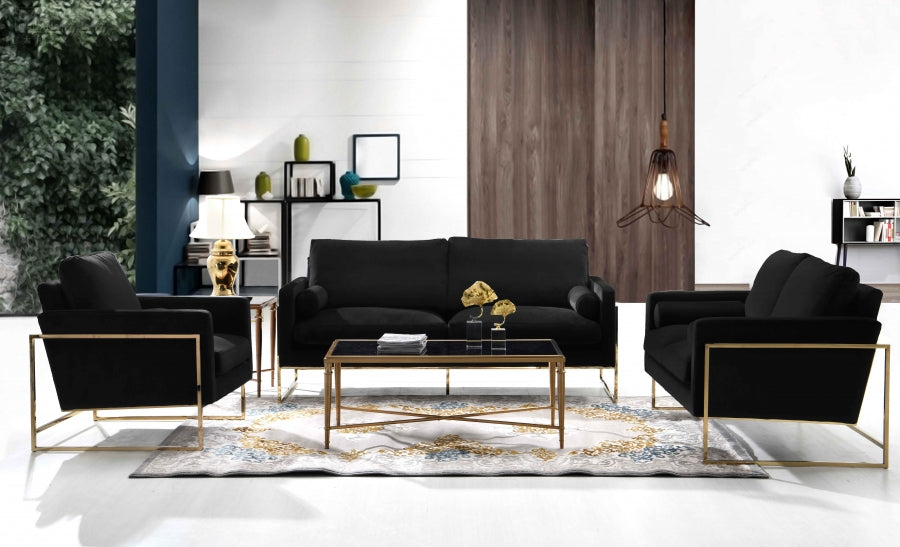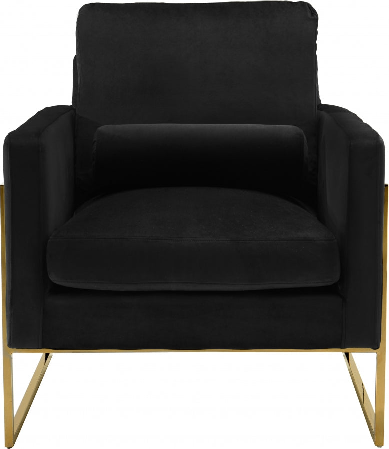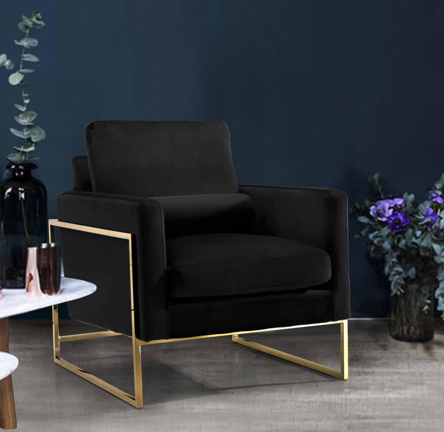 Seat guests in complete luxury on the Mila Black Velvet Chair. The bold black color makes a statement in your space, and the gold stainless steel frame ensures sturdy support while you relax or take a nap. It comes with two throw pillows that cradle your sides as you sit, elevating its comfort level. Lots of clearance beneath this sofa makes cleaning and vacuuming a breeze. Buy it alone or pair it with the matching sofa or loveseat!