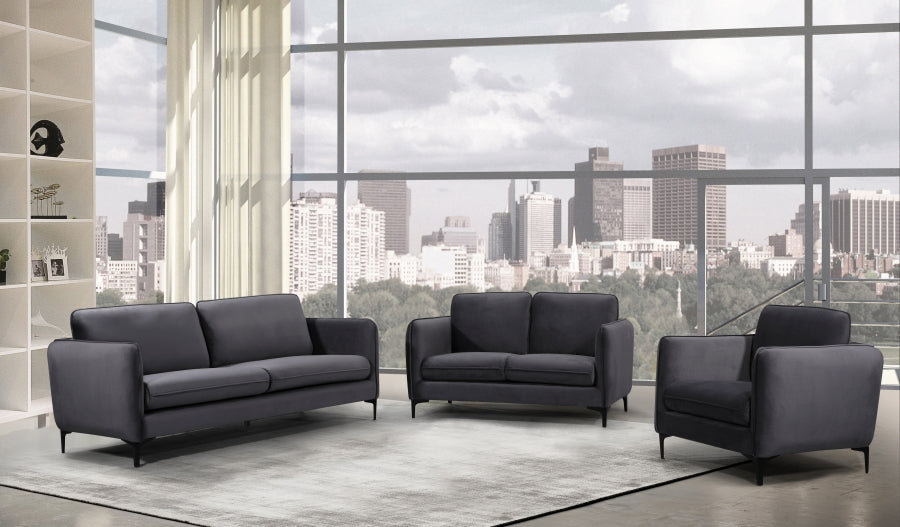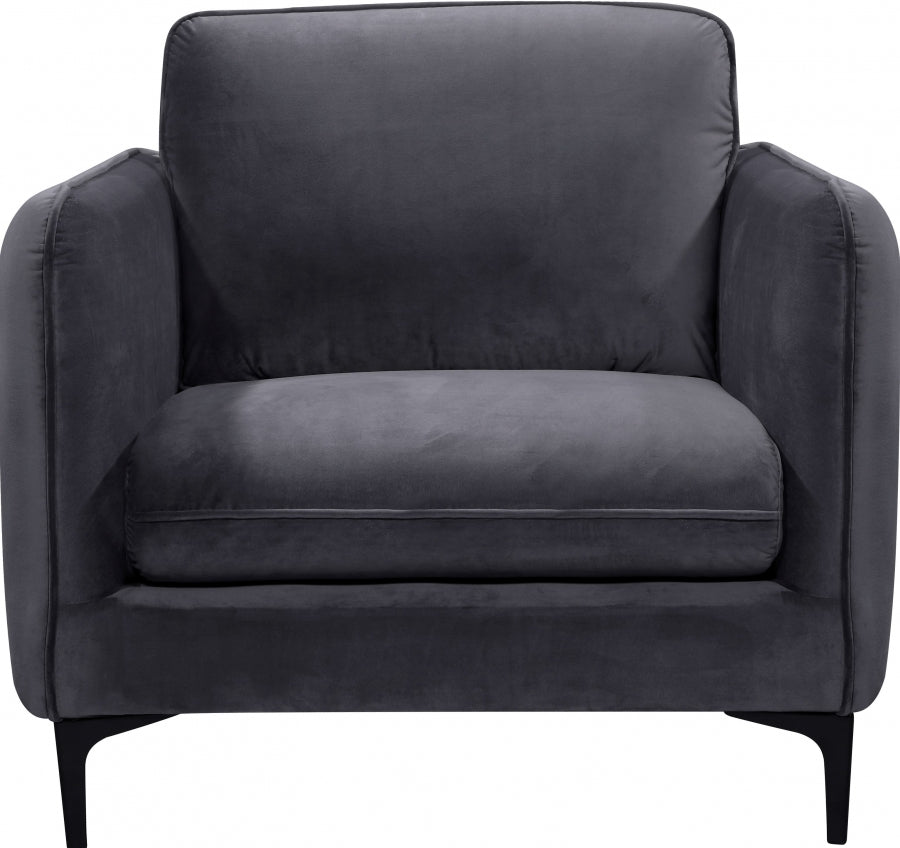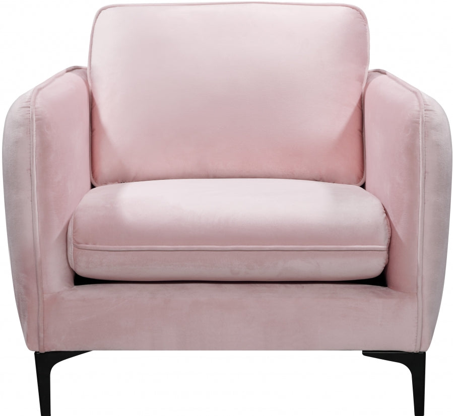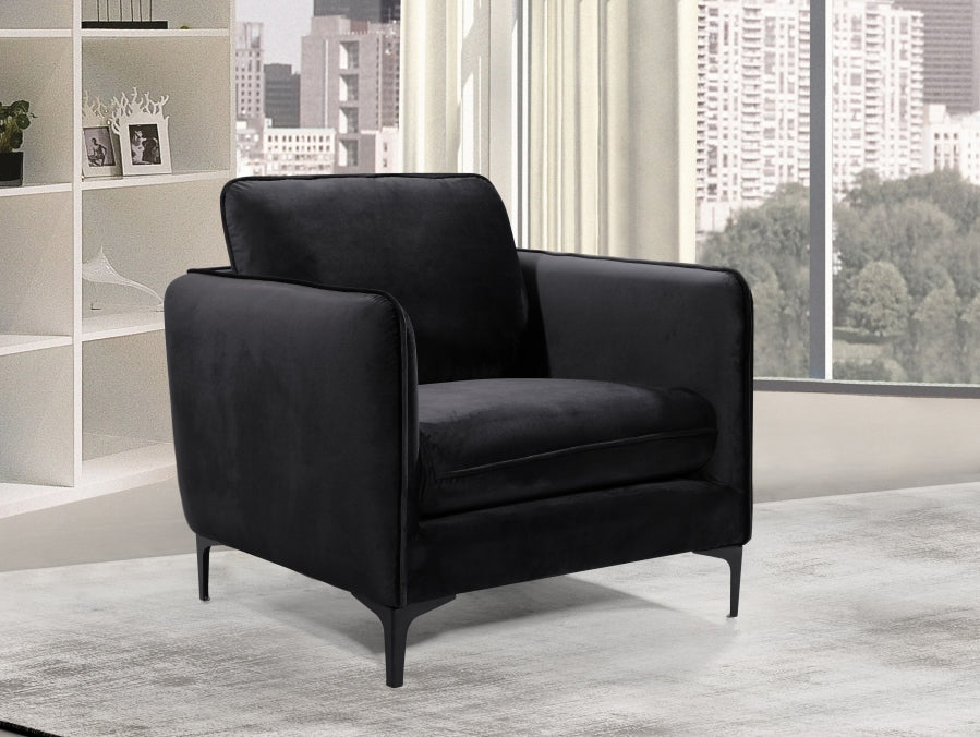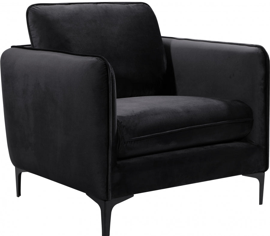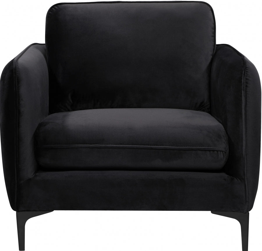 Transform your living space into a chic haven with this stunning Poppy Black Velvet Chair from Meridian Furniture. Rich black velvet upholstery creates a soft, luxurious space for you to curl up with a book or in front of the TV on a rainy day, or just kick back and relax after a long day at work. Its plush back cushion offers ample support for your back while adding to the chair’s contemporary design, and matte black metal legs pull the piece together, making it a stylish choice for any room.