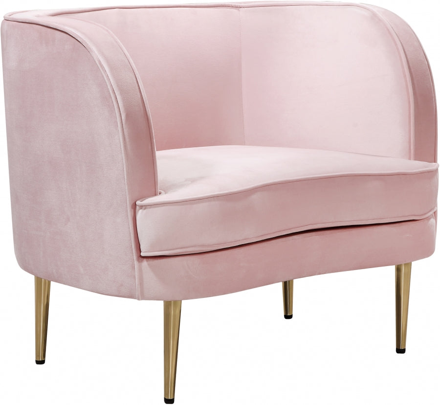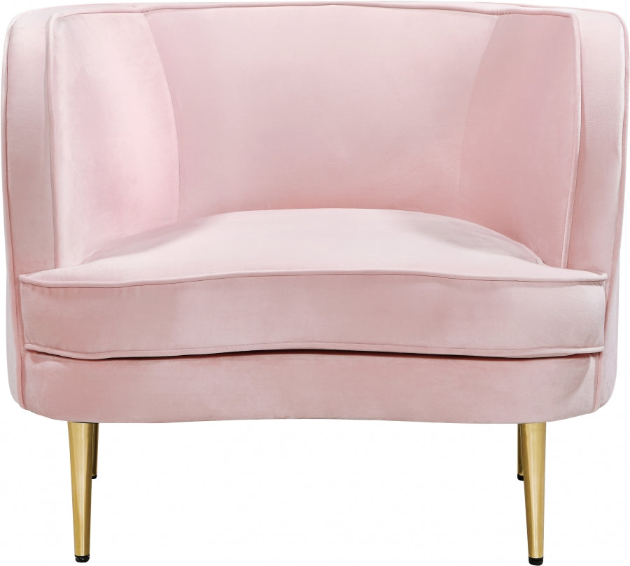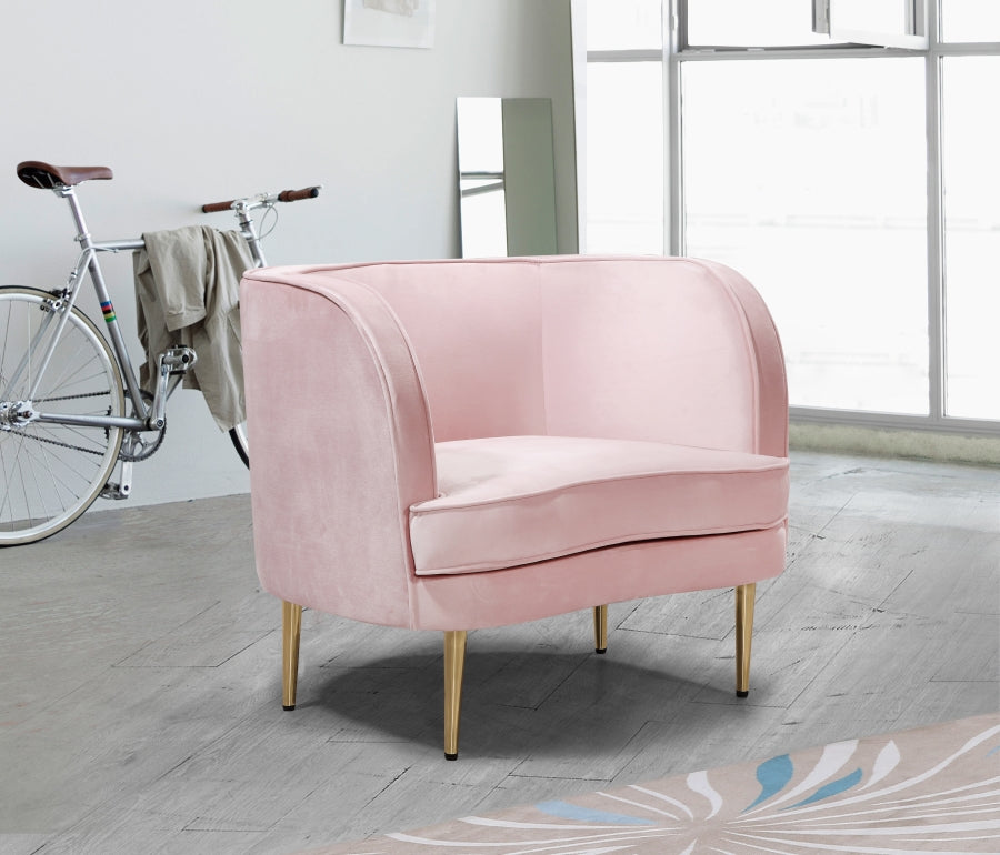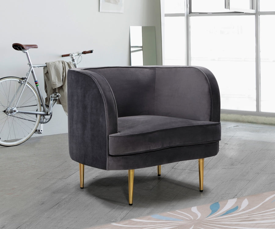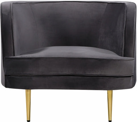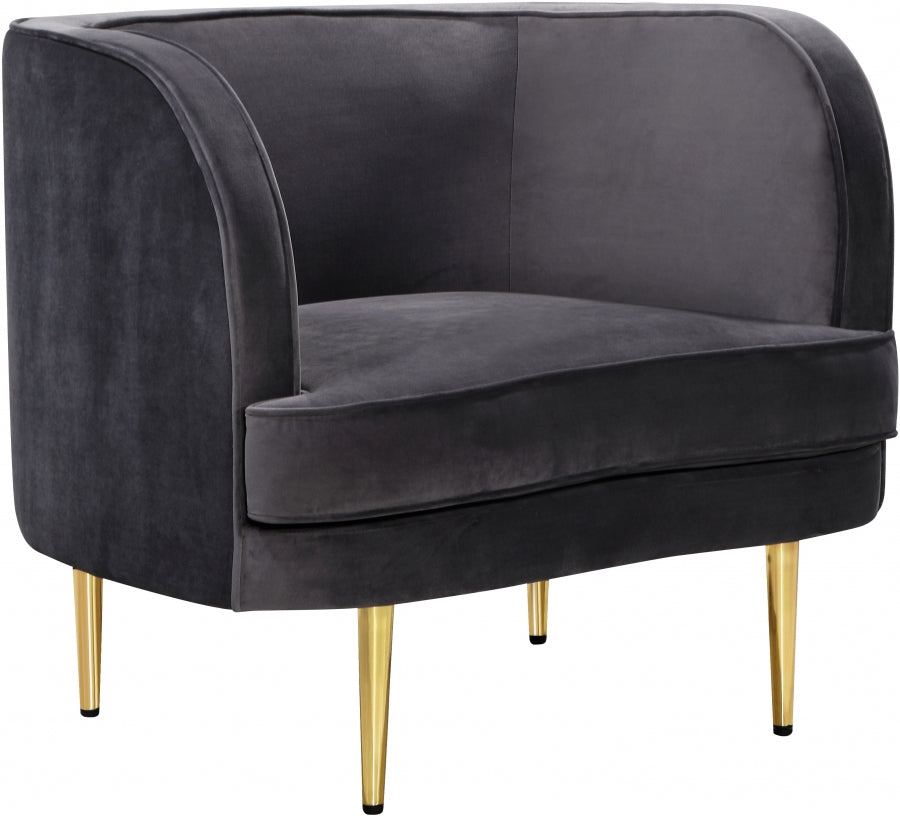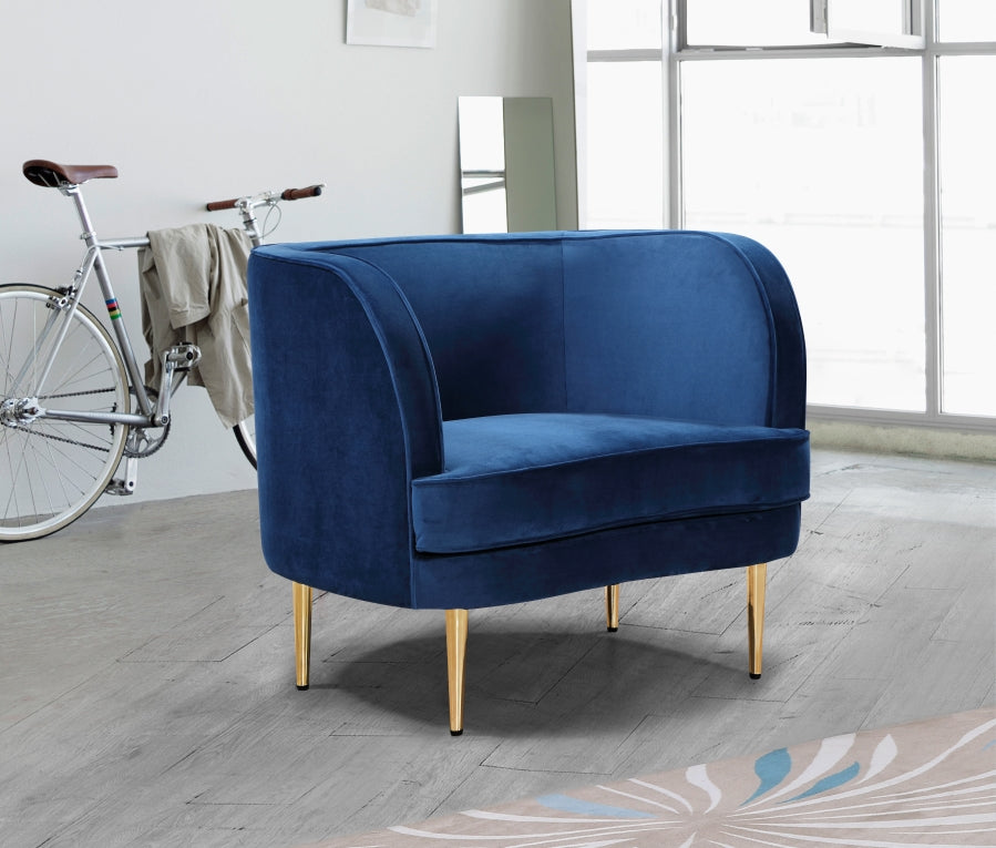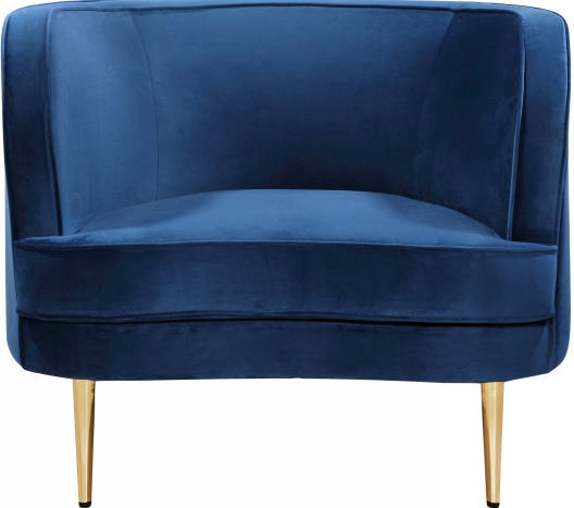 Get comfy in this luxurious Vivian Navy Velvet Chair from Meridian Furniture. Featuring stunning rich navy velvet upholstery and a curved design, this contemporary chair adds simple elegance to your contemporary decor, while providing you with utmost comfort as you kick back and read a book or watch TV. Gold metal legs complement the chair's deep grey color, while offering sturdy support and lifting the seat high enough off the floor to make vacuuming beneath it a breeze.