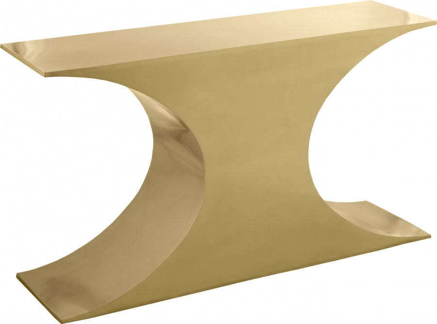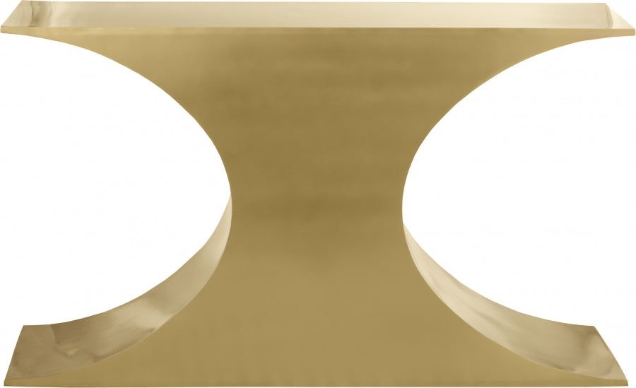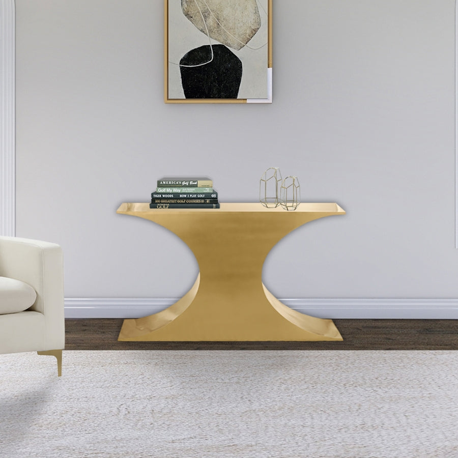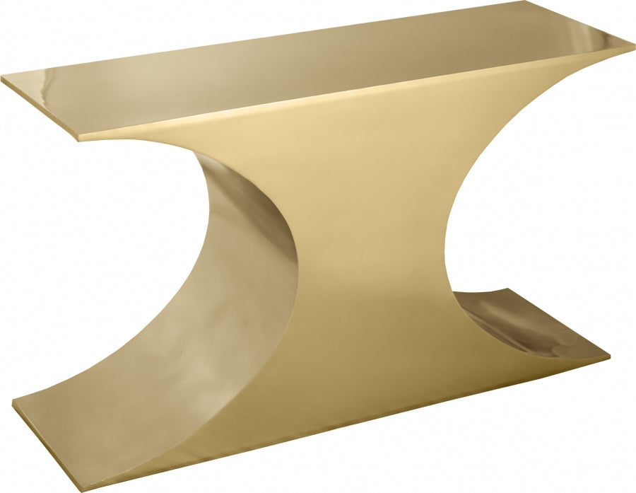Pull your room together with the addition of this Russo Console table from Meridian Furniture. This gold metal table features a contemporary design that is sure to catch the eyes of all who behold it, making it a great centerpiece or accent piece for your modern living space. Place this table in your living room, family room, den, or bedroom to create a sophisticated and stylish look your guests will be talking about for years to come.
