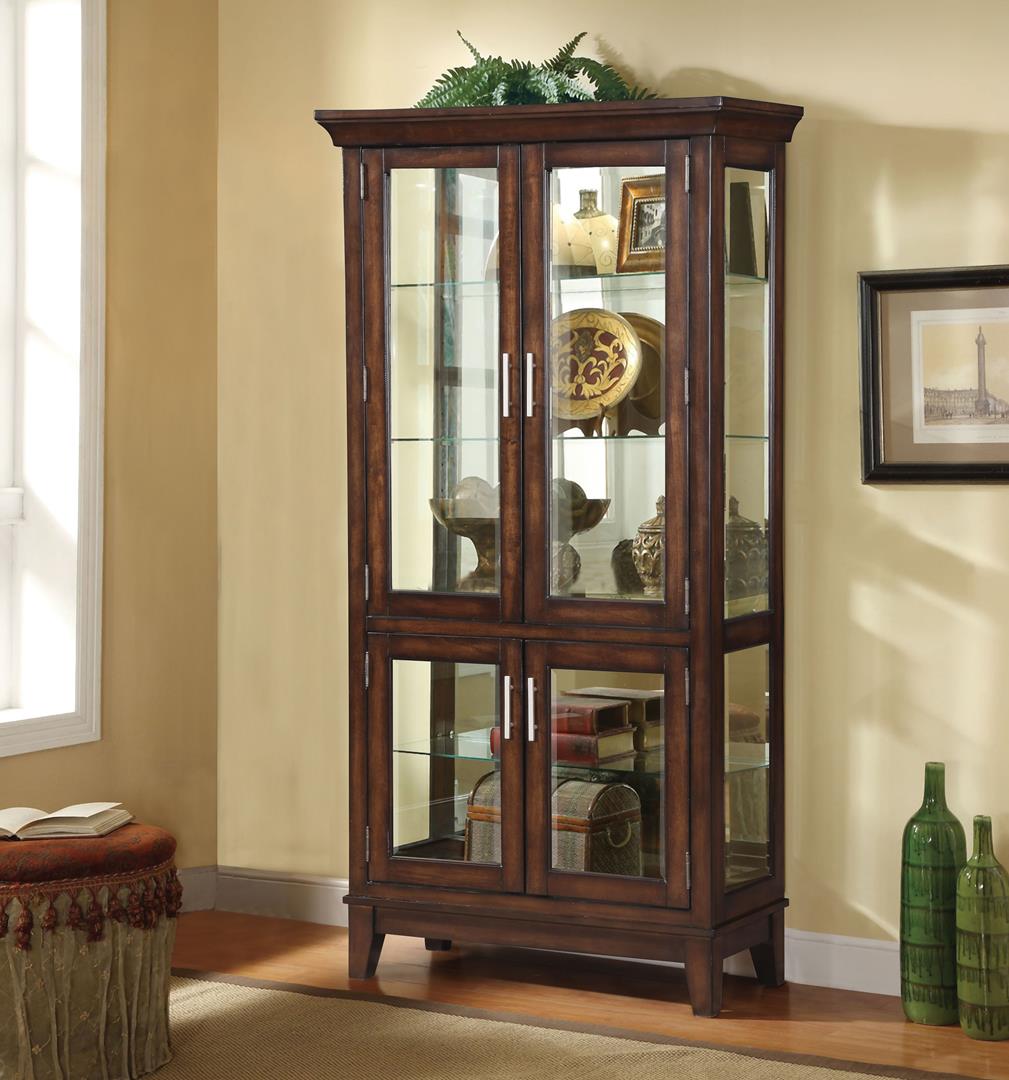 The Jaxson Curio Cabinet is traditionally designed to blend easily with your home design. The gorgeous four door glass and wood cabinet features a rich cherry finish with clear glass side panels and six tiers to provide ample storage and display space. The curio offers mirror back cabinets with adjustable glass shelves and single touch lighting. Crown molding trim, tapered feet and distressed detailing make this cabinet a traditional piece that is both unique and stylish.