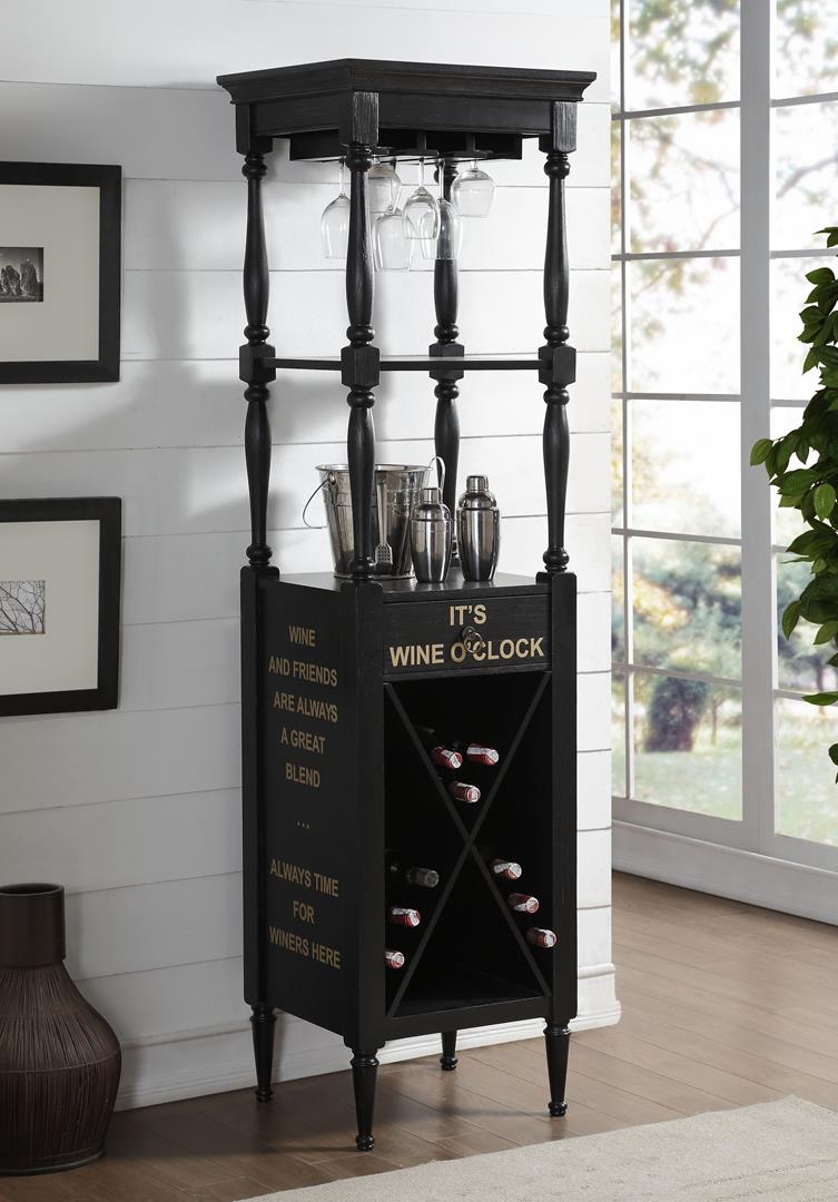 The Anthony Wine Cabinet is a stylish and convenient addition to any bar area. This tall wine cabinet is a must-have structure to keep drinks and glassware within easy reach. The decorative carved designs along the upper area offer a peek at your treasures while a center drawer and lower wine racks provide safe haven for smaller and more delicate items.