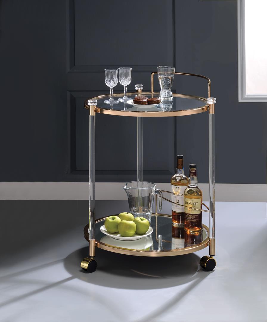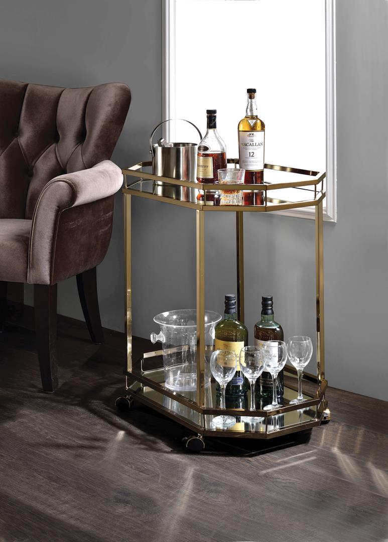 Show off your personality with the Lacole serving cart, featuring a metal frame finished in champagne and mirrored shelves for that glam appeal. The two 2.5 mm mirror shelves are the ideal place for placing your dishes and dining accessories. Roll it where need be on its softer rubber wheels and prepare to entertain.
