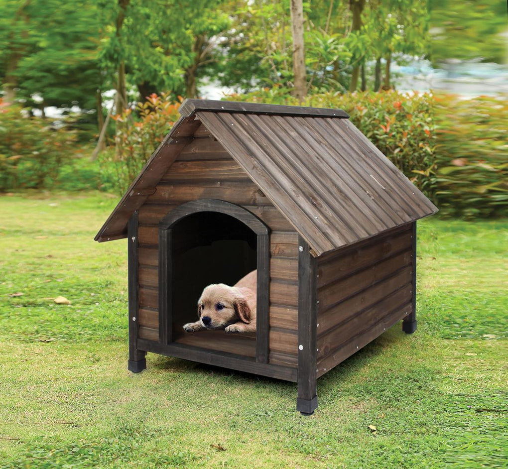 Protect your best friend from the elements with this oak-finished dog house. The raised floor keeps your dog dry, and the roof slants toward the back of the structure to prevent water from accumulating in front of the dog house door. Log-cabin styling makes this dog house an attractive yet functional addition to your yard.