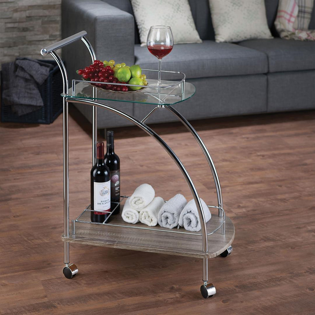 Featuring a retro inspired design, the Badin serving cart has a floating top glass shelf for immediate access and a lower gallery shelf to keep your additional items safe from falling out. Finished in chrome and rolling on four plastic casters, this cart is a save all for an gathering. This sophisticated serving cart also has a wine storage unit that can store up to three wine bottles.