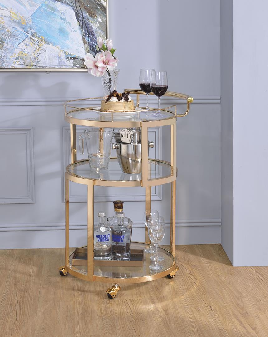 The Madelina serving cart is a crucial helper in the dining area with three shelves and four caster wheels. It features a safety stop for stability, ample storage space for dishes and beverages, and easy to handle with grip. This cart's outward appearance will enhance the whole dining room.