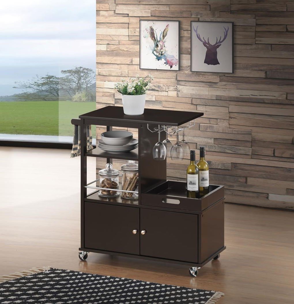The Hadar kitchen cart is perfect for adding additional workspace and storage to your kitchen area. The cart features serving tray, stemware rack, and interior storage space. Easy roll casters provide for easy mobility around your room. The wenge finish is perfectly accented with modernly styled silver pulls.