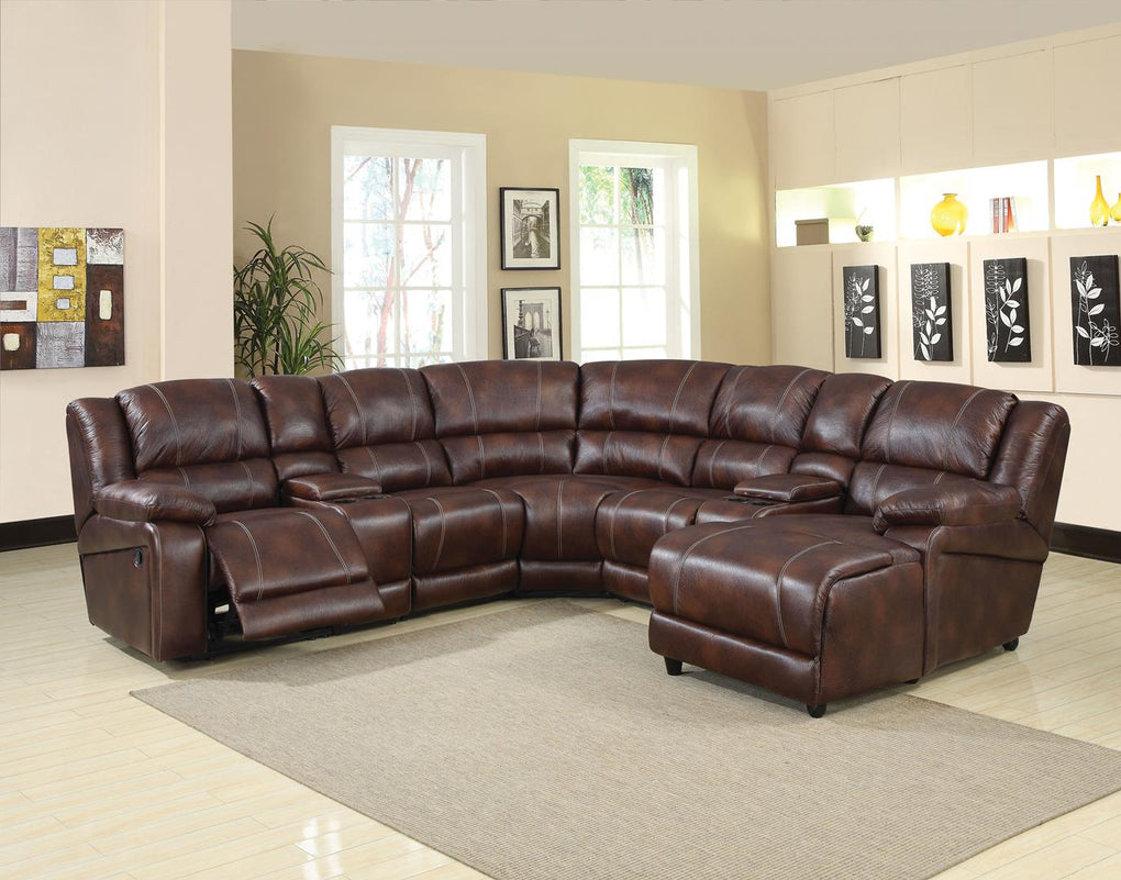 The Zanthe contemporary sectional will bring a sleek style to your living room environment. Features oversized comfortable seating, durable brown polished microfiber upholstery with decorative double stitching throughout. This set includes a right facing chaise, two hidden storage compartments, a single reclining chair, and is complemented by cozy lounge chaise which is perfect for family amusement.