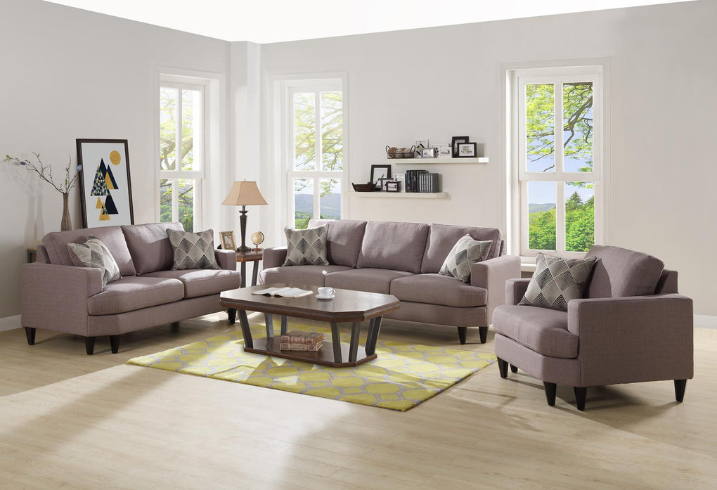 Enjoy every inch of comfort in the Selma chair. Boasting a luxurious linen fabric that will create a warm look in your home, this sofa, loveseat, and the chair has soft cushions that will surround you, providing comfort and relaxation in all the right spots. Tapered wooden legs and track arms accentuate the casual elegance which emerges from this contemporary living room set. Contrasting diamond pattern pillows complete the collection. With smart style and modern character, this is the ideal living room group whether you are entertaining or simply looking for a place to spread out and relax.