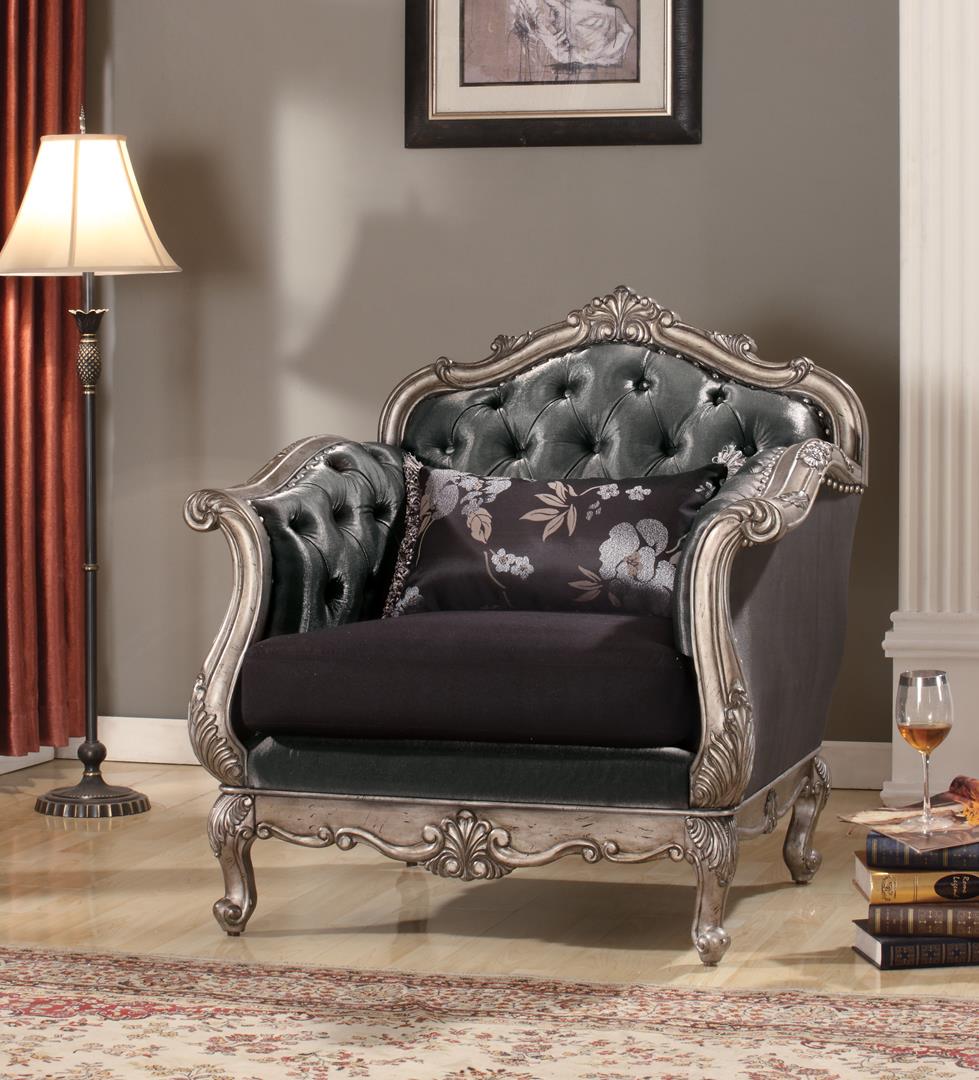 The Chantelle chair is filled with sophistication and romantic wonder. This chair features a French rococo tufted seat back complemented with an antique platinum and silver gray silk like fabric seats, and one pillows. Add this chair to any living room that needs the touch of class and beauty in a beautiful seating option.