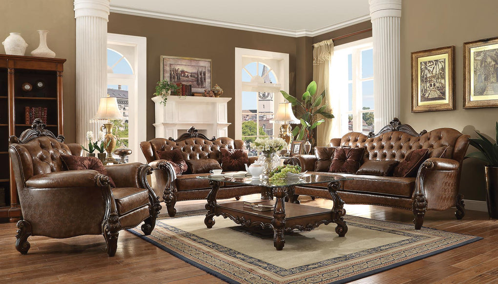 The Versailles collection with cherry oak finish will create you an elegant, warm and traditional taste in your living room. The sofa set reflects highly decorative base with scrolled feet, and the upholstered seats with the deep button tufted and Nailhead trim accents add classic character and represents luxurious detailing. The collection is your perfect choice for your living room.