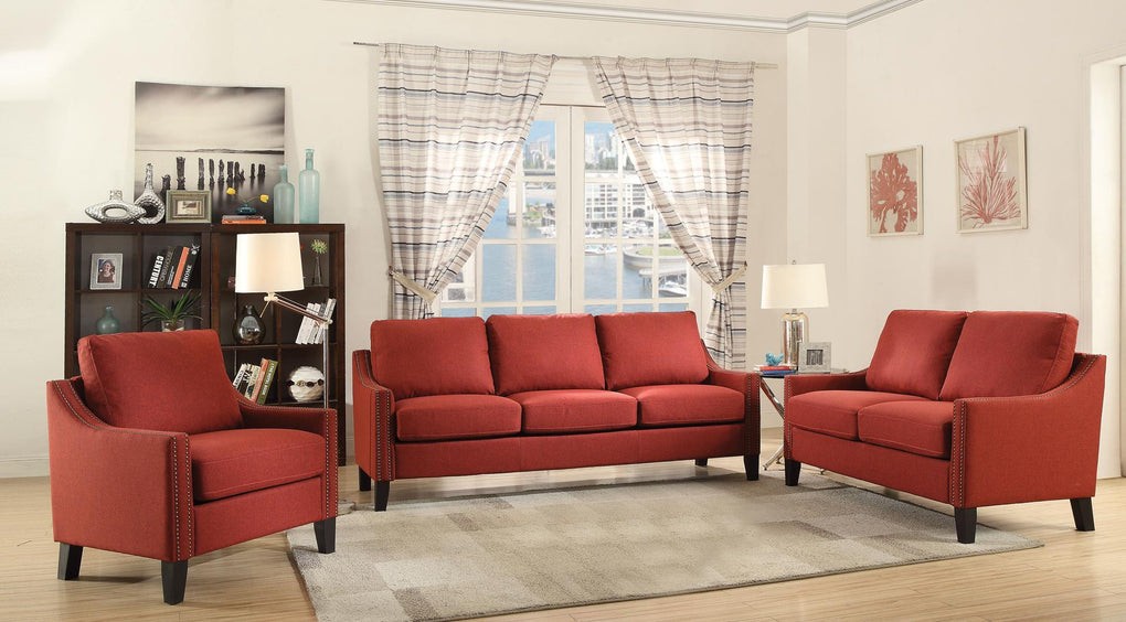 The Zapata chair will bring comfort and a contemporary style to your home. This chair features gently sweeping low track arms with nailhead trim, plastic black tapered legs and loose seat and back cushions with thick padding. The red linen upholstery is comfortable and sure to make this chair center piece of any living room. Some Assembly Required.