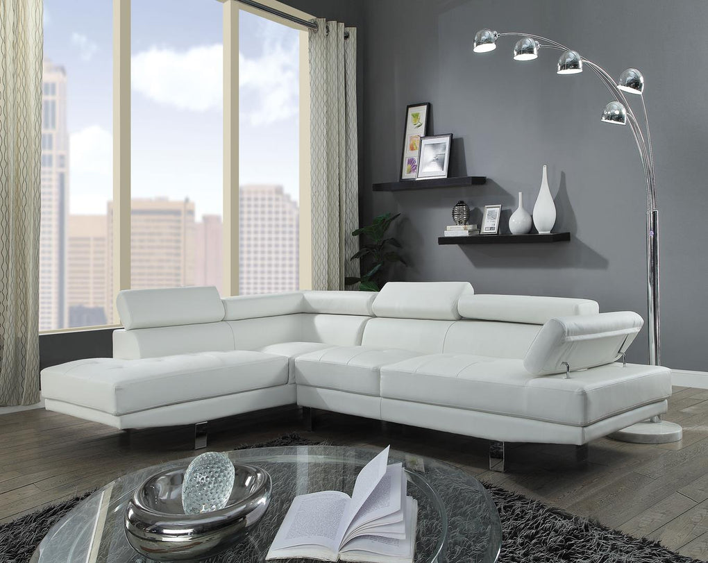 The Connor contemporary chrome leg sectional covered in black or cream PU is an excellent choice for your living room. The sectional also offers added comfort with pivot headrest that can adjust for people of different heights.