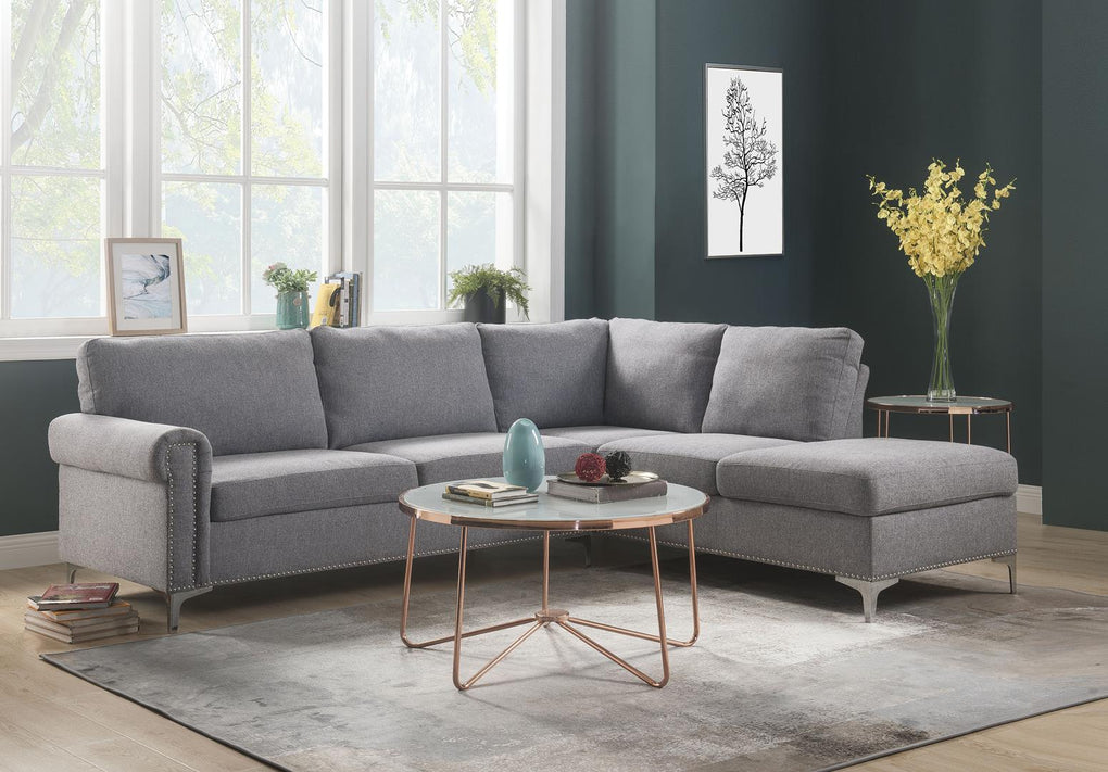The striking Melvyn sectional sofa is sure to imbue your entertainment space with a touch of updated, contemporary style. A fusion of style and comfort, the sofa features a clean-lined silhouette with a durable wood frame and chrome-finished legs. This modern L shaped sectional features a left facing loveseat and right facing chaise. Wrapped in a rich chocolate fabric upholstery with a rolled arm with nailhead trim, ideal for any living room Decor. This sleek design sofa truly is the picture of modern aesthetics.