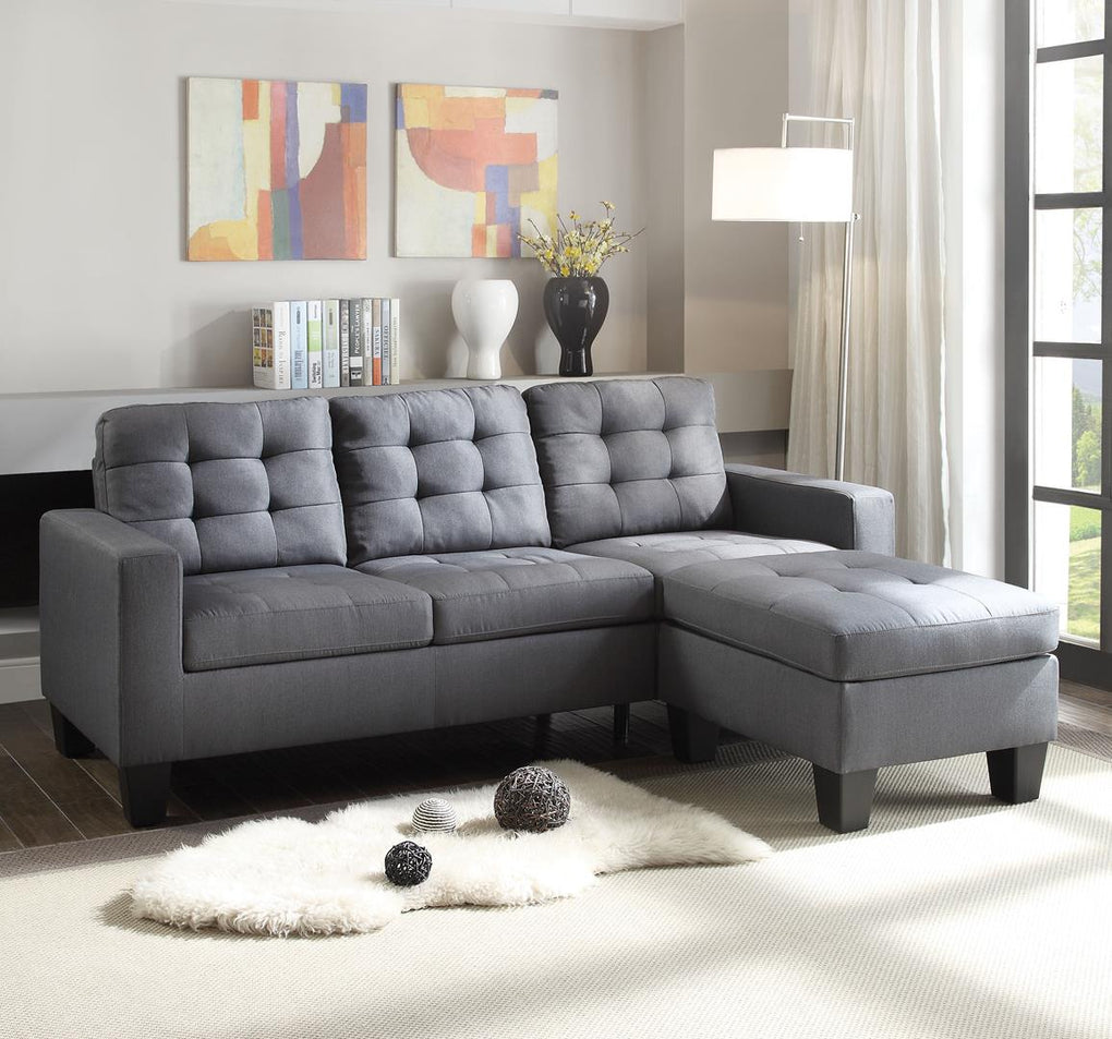 With its contemporary inspirations, this elegant collection features a "L" sectional sofa, reversible ottoman and wood-like tapered legs. With the Buttonless stitching details, tufted accents makes this one like a showpiece in your living room.