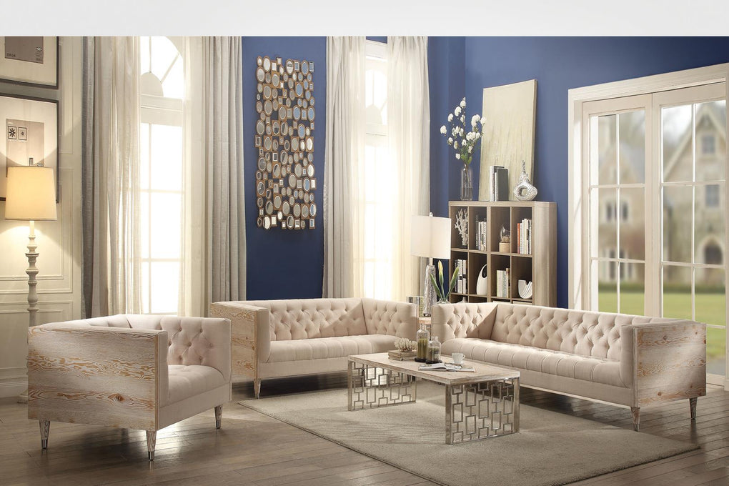Characterized by shelter arms and wooden panel, the Portia sofa will give your living room a different and eye-catching look. This beige upholstered sofa features button tufted back and armrest to provide you and your guests more comfortable seating experience. This piece is the best choice for your living room.