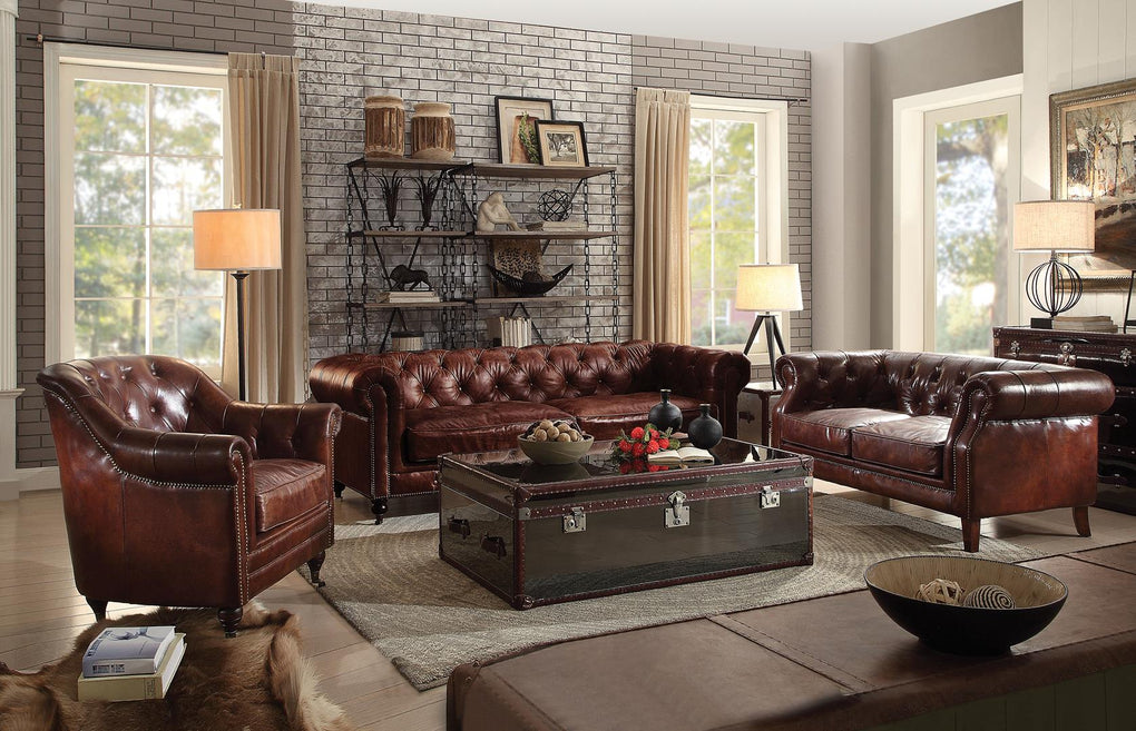 The Aberdeen collection combined with different materials to bring you an undeniable sensation into your person live environment. Its vintage dark brown leather sofa set represents your elegant personality, and its matching aluminum trunk coffee table decorate your home full with technology sense. This unique design absolutely transforms your home from better to the best.