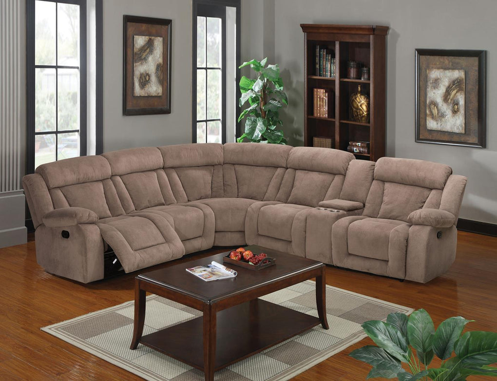 The sleek and stunning Kylie motion sectional sofa fuses charm and design to create the ultimate in relaxation. This modern L-shaped sectional sofa set will perfectly accommodate any contemporary living room setting providing luxury and comfort. The sofa features tan fabric upholstery with stitching, plush seat and back cushions, and pillow top armrests. With three reclining seats and curved wedge, this gorgeous piece provides luxurious and stable support and spacious seating. A console with cup holders and storage add to its functional design.