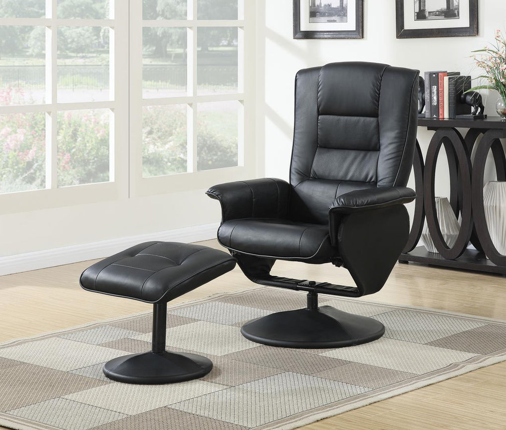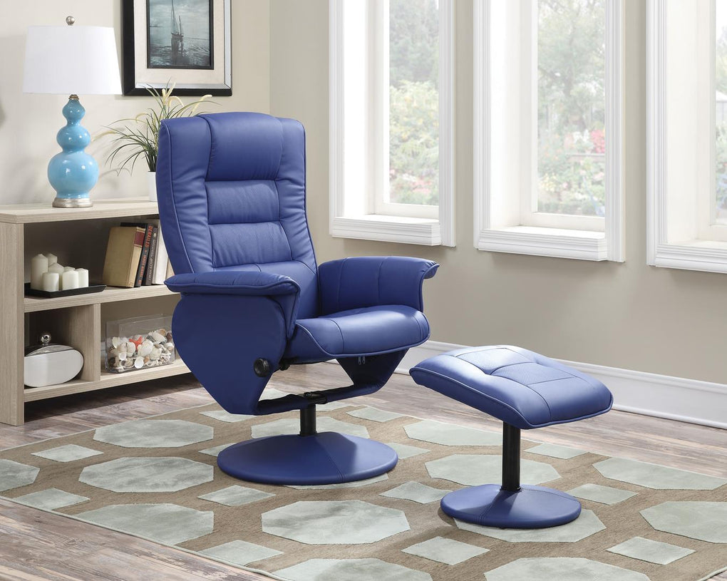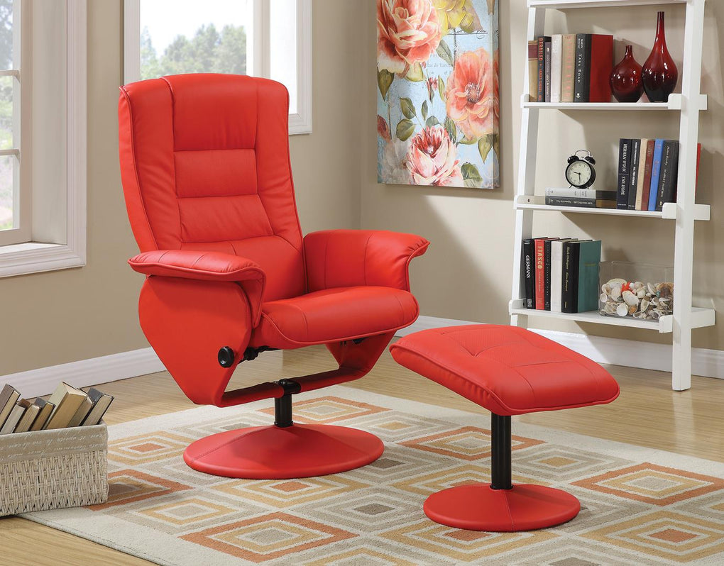 The Arche Recliner Chair & Ottoman will add a comfortable and stylish look to your den or bedroom. Let your body sink into the foam-filled soft upholstery, and recline the back for the ultimate in relaxation after a stressful day. The chair's comfort belies its sturdy and durable PU, board, and metal construction. Available in red, black, and blue color.