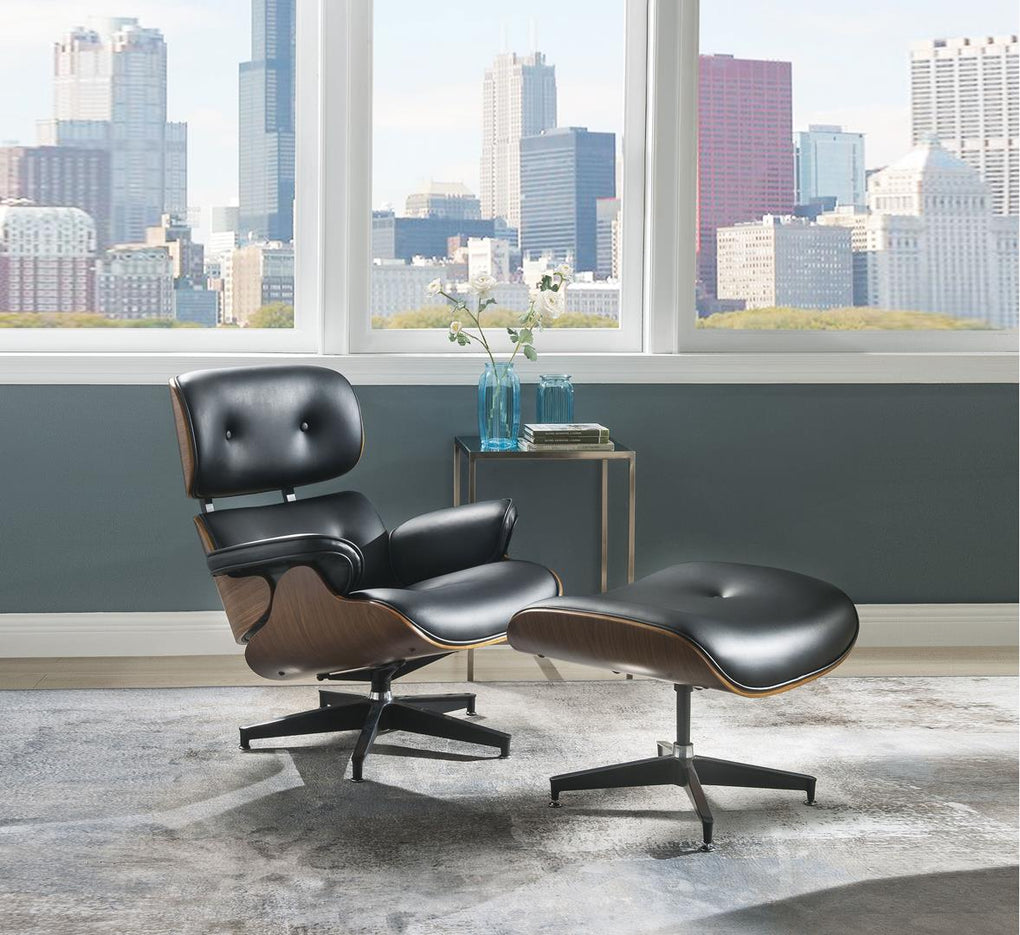 Keary 2Pc Pk Chair & Ottoman, Black Bonded Leather & Walnut