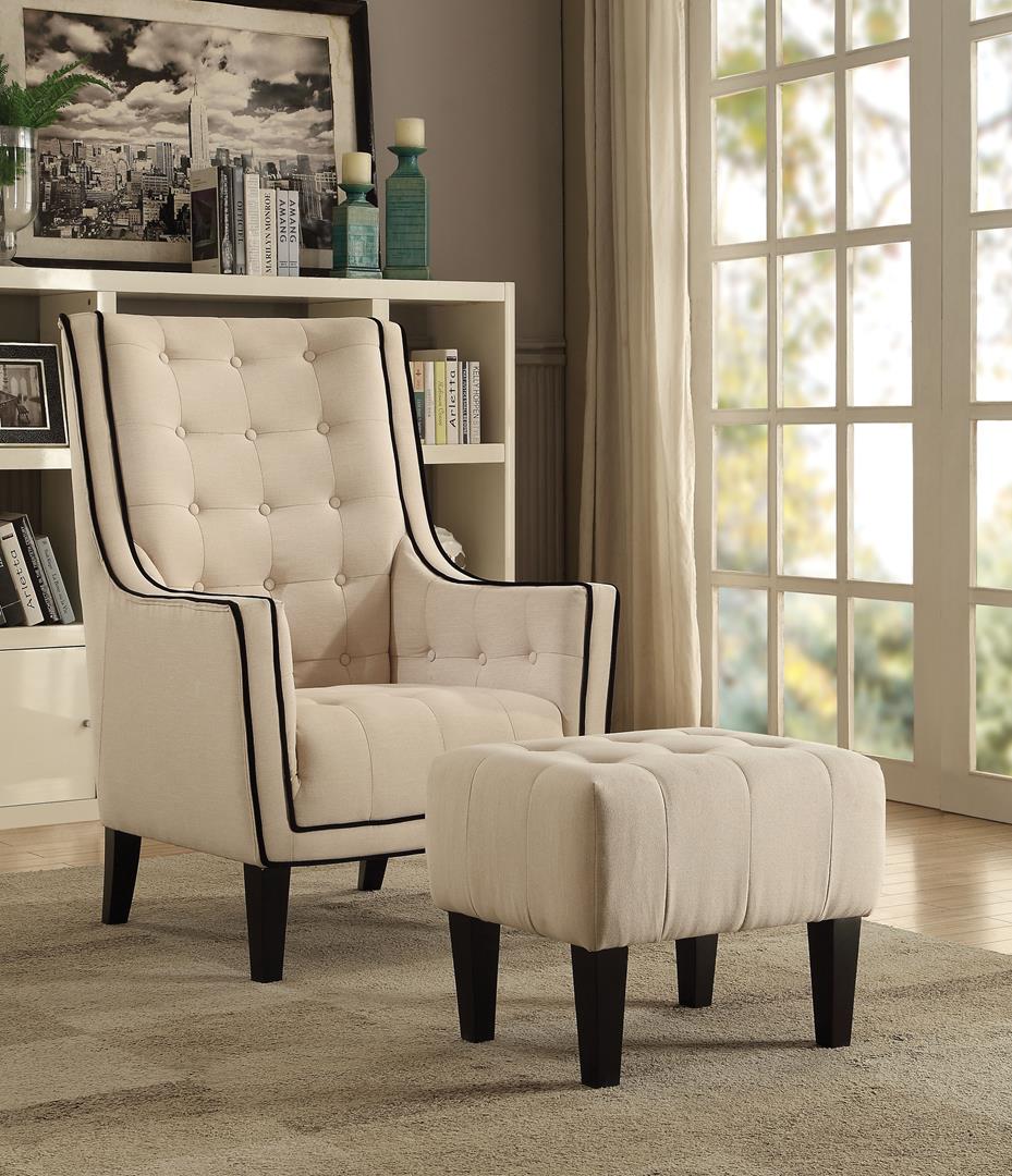 Mixing traditional and contemporary elements create this stunning accent chair and ottoman set. The chair is wide so there is plenty of room to relax in many positions. This Ophelia collection features a linen covering and contrasting piping and is available in 3 colors, Purple, Cream and Black. The seat back is button tufted to give it traditional feel while the flanking sweeping arms create a more modern touch. The chair is supported by angled tapered wood legs.