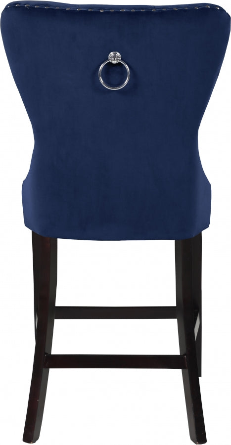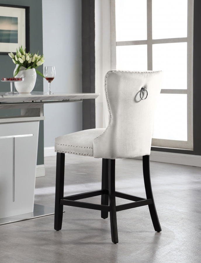 Lounge in luxurious style with the Nikki black velvet counter stool. Featuring a curved high back, plush cushioned seat and deep tufted black velvet upholstery studded with chrome nailheads, this counter stool is sure to take your dining experience to a whole new level. Espresso wood legs provide sturdy support and complement the stunning black upholstery for a sleek, contemporary design.