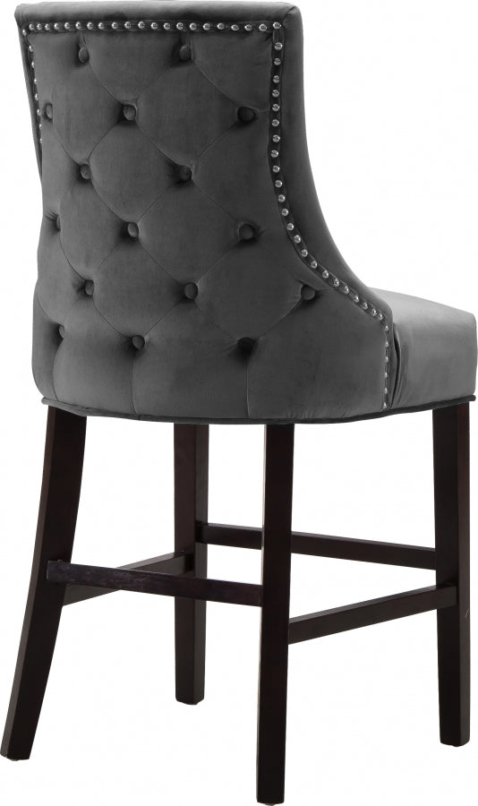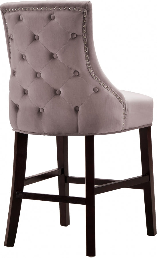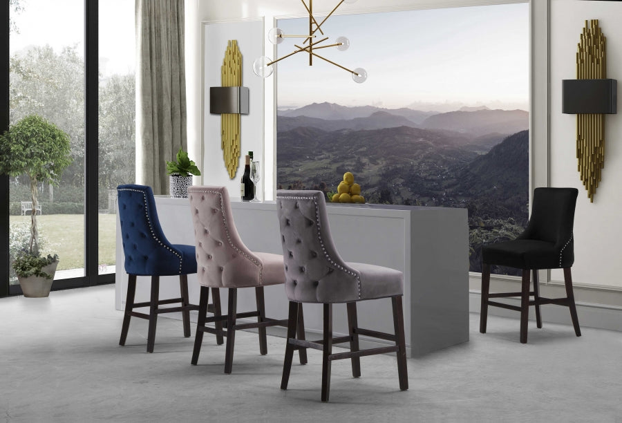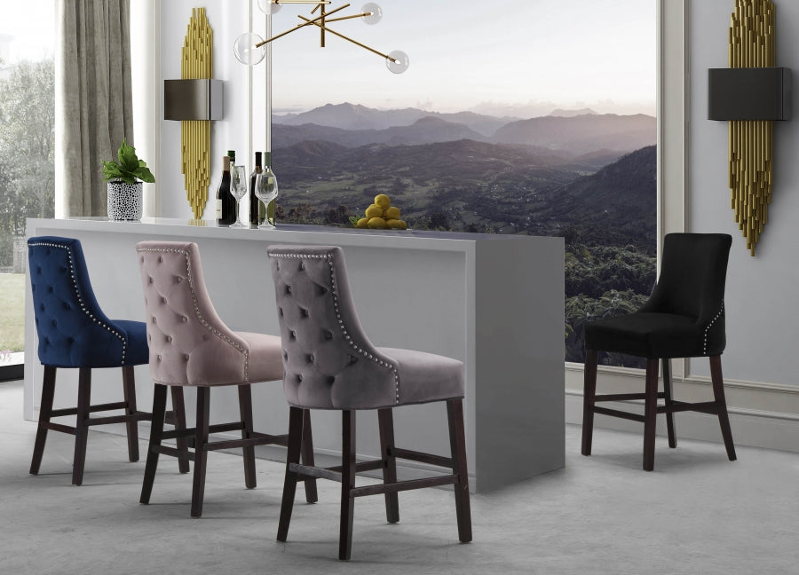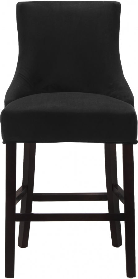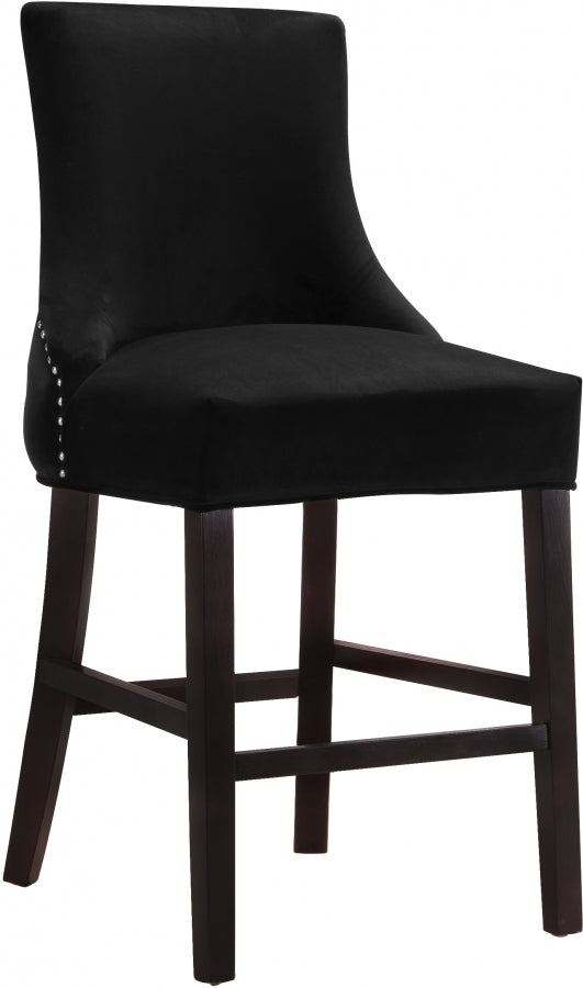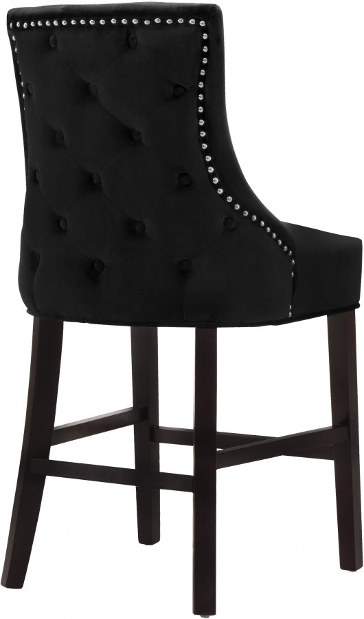 Add this Hannah Black Velvet Stool to your home bar or kitchen counter to seat guests comfortably and in chic fashion. The black velvet upholstery is thick and durable and has a slight sheen for a touch of glam. The back of the seat has deep button tufts for a posh look, while the front features smooth velvet upholstery for sleek comfort. The base is made from wood with an espresso finish and has a foot rail for extra support and comfort as you sit.