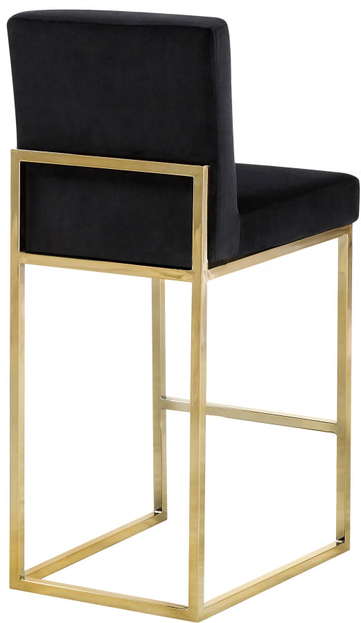 Outfit your home bar or kitchen counter with this Giselle Black Velvet Stool. The sleek black color is perfectly suited to contemporary decor and fits well with other neutral-colored furnishings for easy integration in your room, and the velvet upholstery is sleek and comforting to the touch and the skin. A gold finish on the metal frame adds to the modern panache of this stool, while a footrail along the front ensures you have a spot to rest your feet while you enjoy pancakes at the counter or a cocktail at the bar.