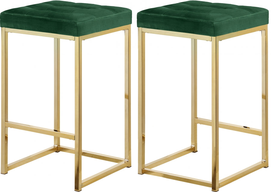 Give your home bar or kitchen counter a fast update with this Nicola Black Velvet Counter Stool. A glitzy gold-finished base made from steel gives ample support and resilient strength to this stool's design, ensuring it lasts and lasts in your busy home. Rich black velvet upholstery covers the plump seat cushion, ensuring comfort till 'closing time,' and tufting on the seat keeps the thick cushion inside aloft while adding to its elegant modern demeanor. A foot rail on the base gives you somewhere to rest your feet while you sit and relax.