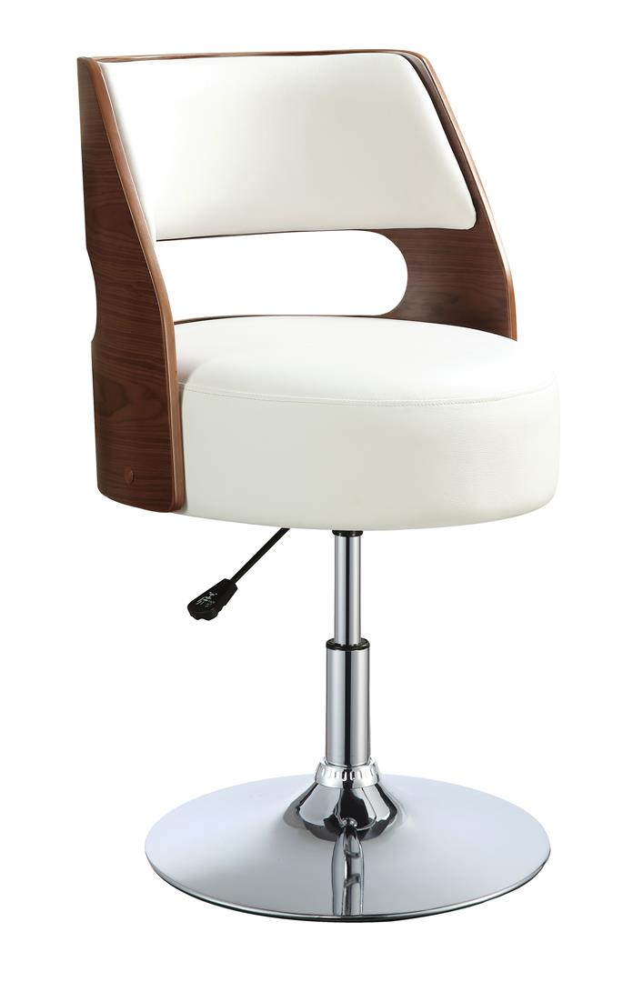 The Camila adjustable swivel bar stool has a unique design that makes it ideal for homes that have modern interiors. It has a frame that is made of metal to ensure sturdiness and durability. The faux leather seat and padded back makes for a comfortable seating experience. It can swivel 360 degrees completely and its height can be adjusted to suit your needs. Stylishly designed, it features a walnut finish frame that adds aesthetic appeal and style to your home. Hydraulic lift mechanism allows you to adjust the seat height, for use with a bar or kitchen counter table. Some Assembly Required.