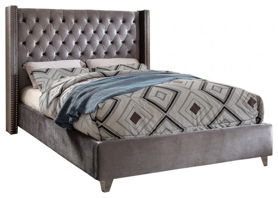 Elegant and eye-catching, the stunning Aiden Bed from Meridian Furniture is the perfect addition to any bedroom. Rich velvet covers the deep tufted design. A beautiful wing bed design is complimented by hand applied chrome nail head details. Strength and beauty is guaranteed with a solid wood frame and stainless steel legs.