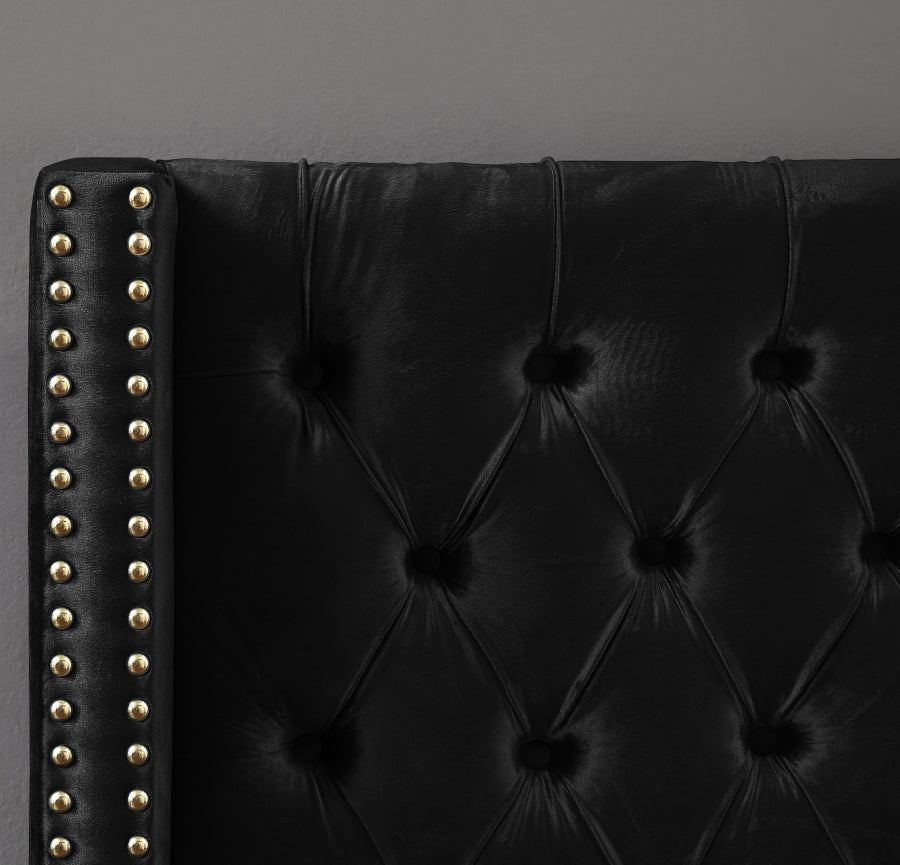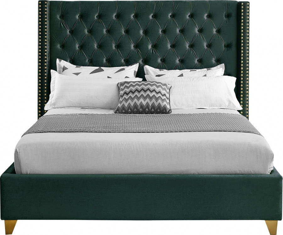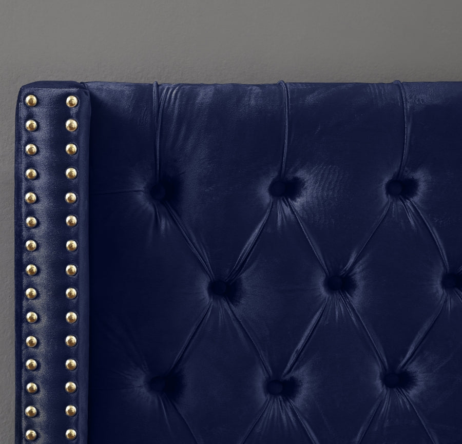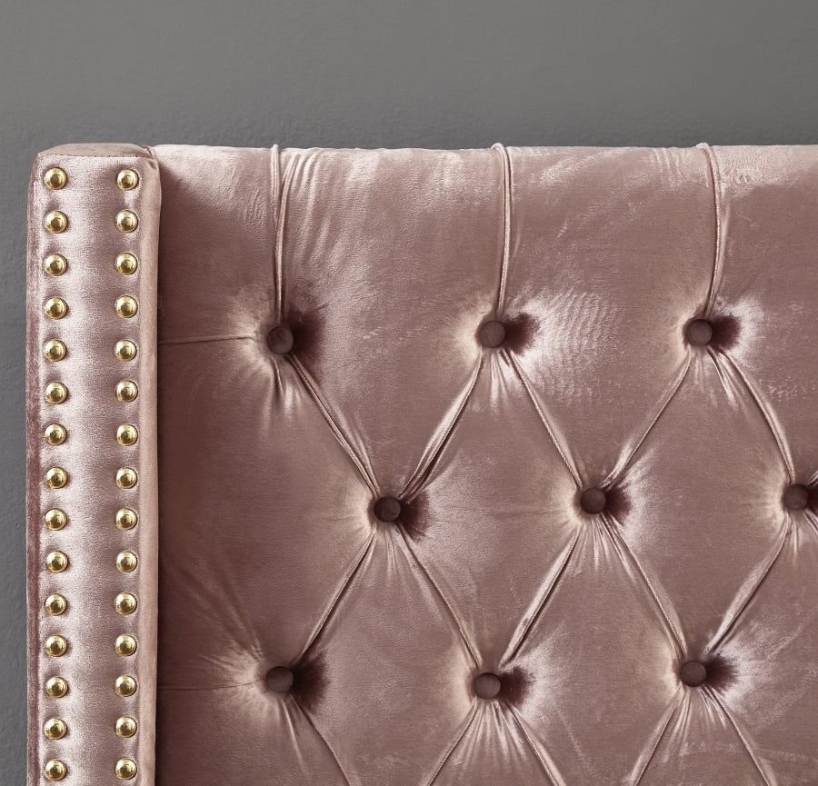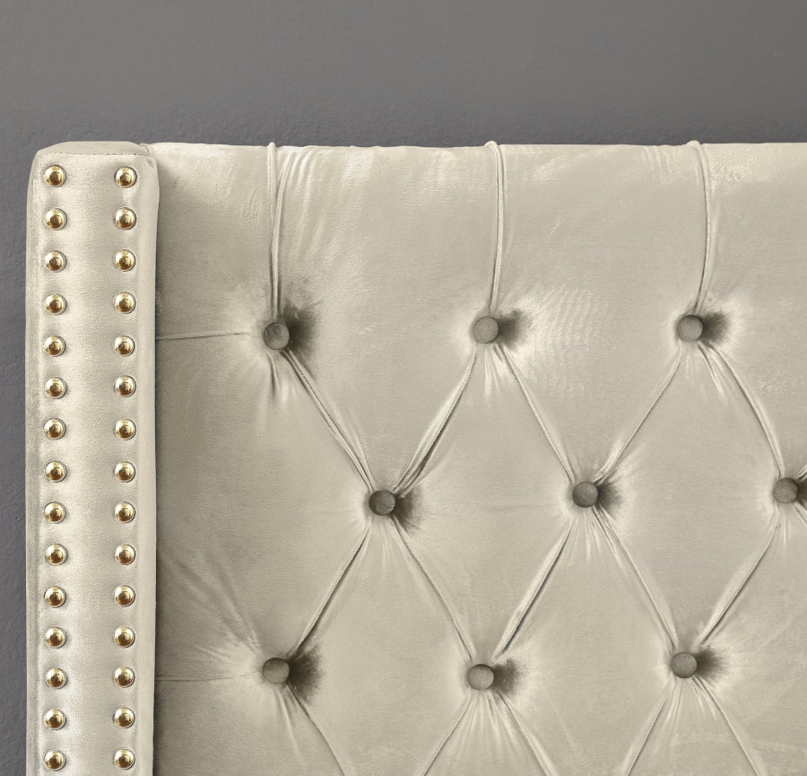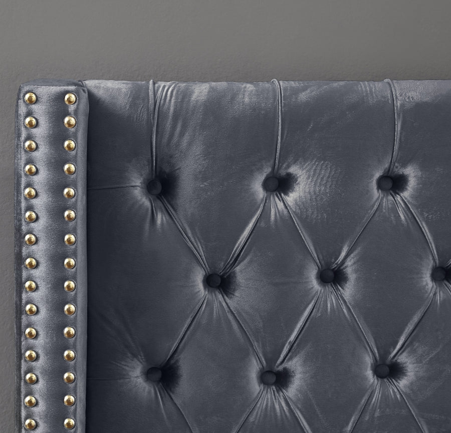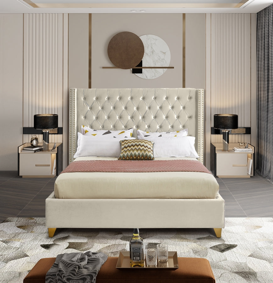 Elegant and eye-catching, the stunning Barolo Bed from Meridian Furniture is the perfect addition to any bedroom. Rich velvet covers the deep tufted design. A beautiful wing bed design is complimented by hand applied gold nail head details. Strength and beauty is guaranteed with a solid wood frame and stainless steel legs.