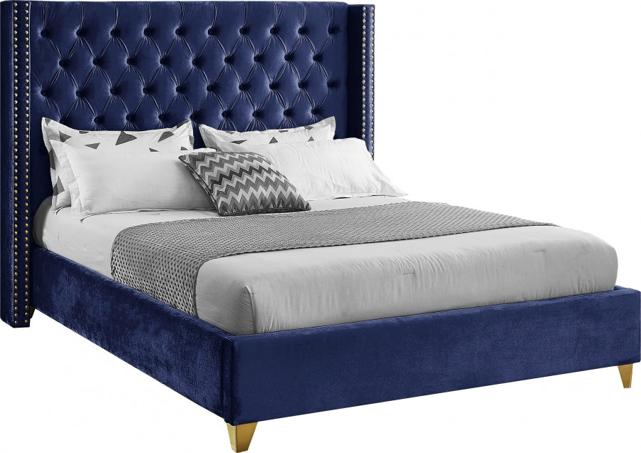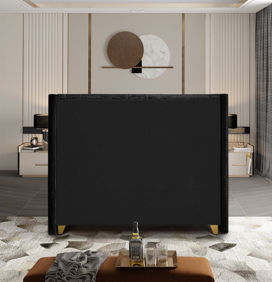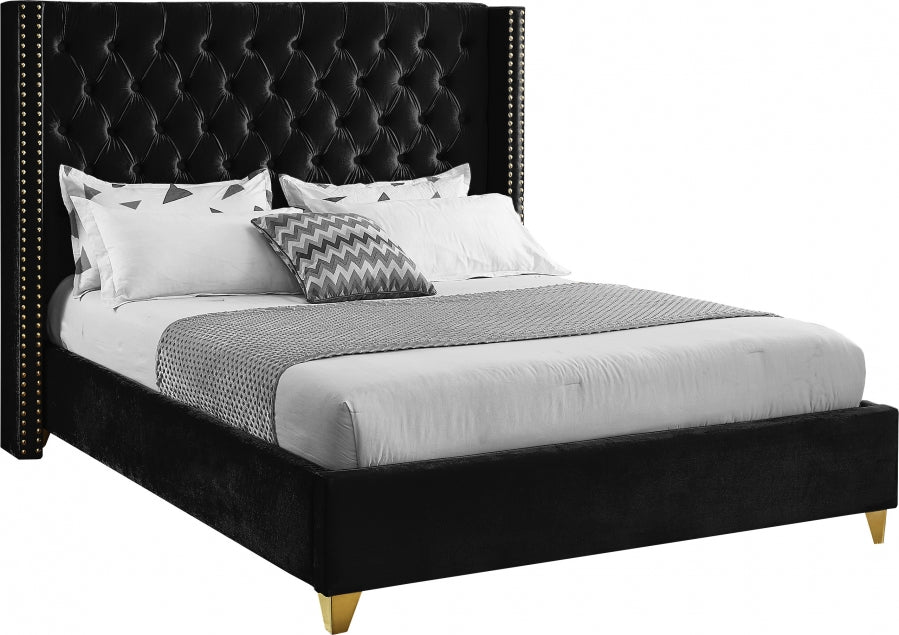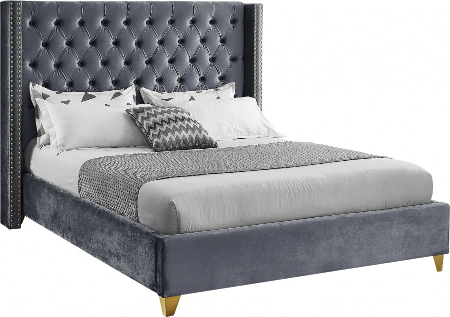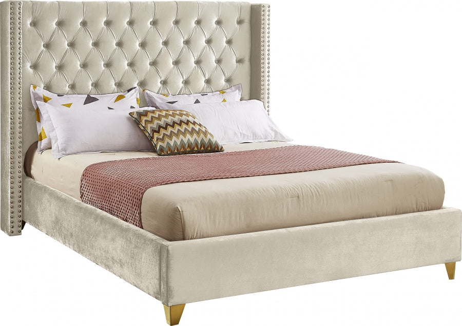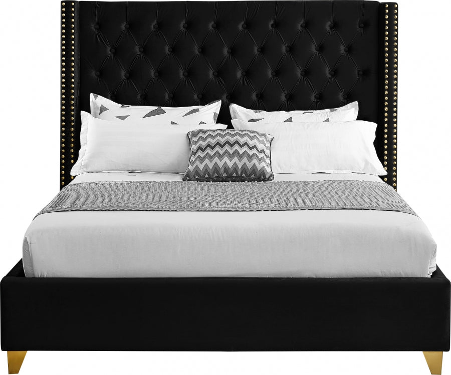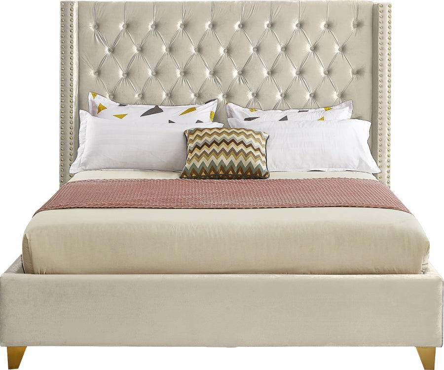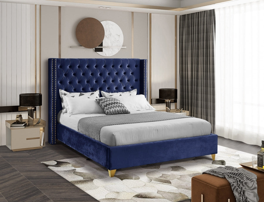 Elegant and eye-catching, the stunning Barolo Bed from Meridian Furniture is the perfect addition to any bedroom. Rich velvet covers the deep tufted design. A beautiful wing bed design is complimented by hand applied gold nail head details. Strength and beauty is guaranteed with a solid wood frame and stainless steel legs.