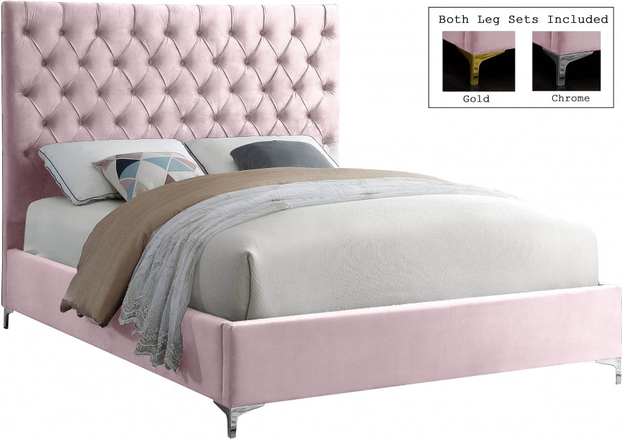 Revamp your bedroom space with this sumptuously crafted Cruz queen bed from Meridian furniture. The star of the show here is the headboard—its tufted with deep button tufts that not only keep its thick padding in place and aloft, but also add a modern, textural look to your space. Sleek black velvet upholstery feels luxuriously upscale to the touch, and the high headboard and the minimalist platform frame with metal feet add a timelessly contemporary silhouette to your space.