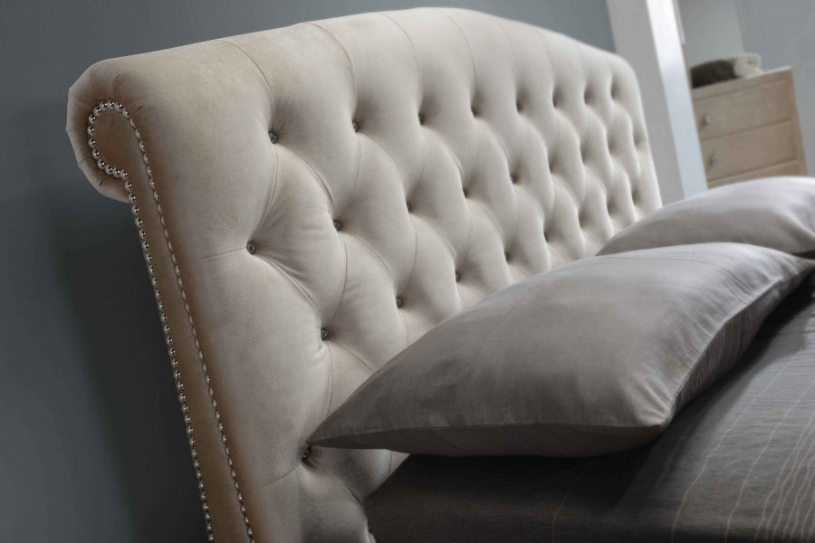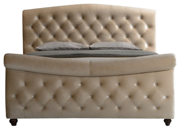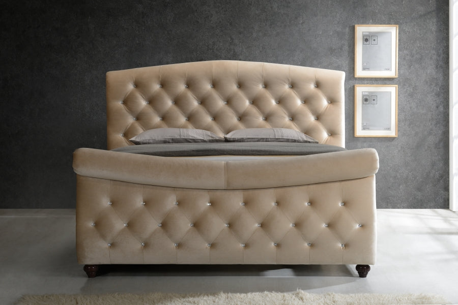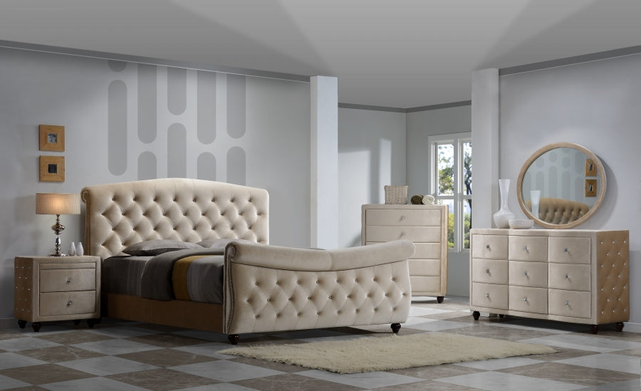 The Diamond Bedroom set is an impeccable example of truly memorable, opulent contemporary design. Your bedroom will be the height of dignified fashions with Golden Beige Velvet and top quality construction. The set features crystal tufting and crystal handles throughout the case goods. Available in the Canopy or Sleigh bed option, with custom velvet covered case goods.