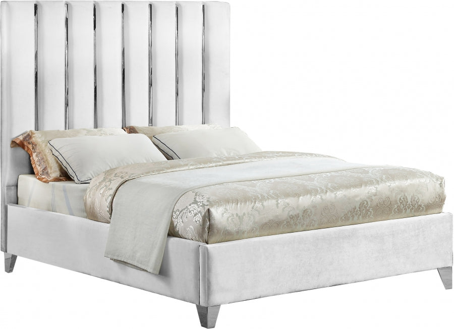 Create a bold yet welcoming sanctuary in your bedroom with this Enzo Black Velvet King Bed. The chrome channel design features velvet fabric upholstery for a sleek, glamorous look. The chrome legs provide support for the plank-style base, ensuring durability and long-lived beauty. Full slats are included, making setup easy and quick. No box spring is required with this bed, so you can use it with your choice of mattress.
