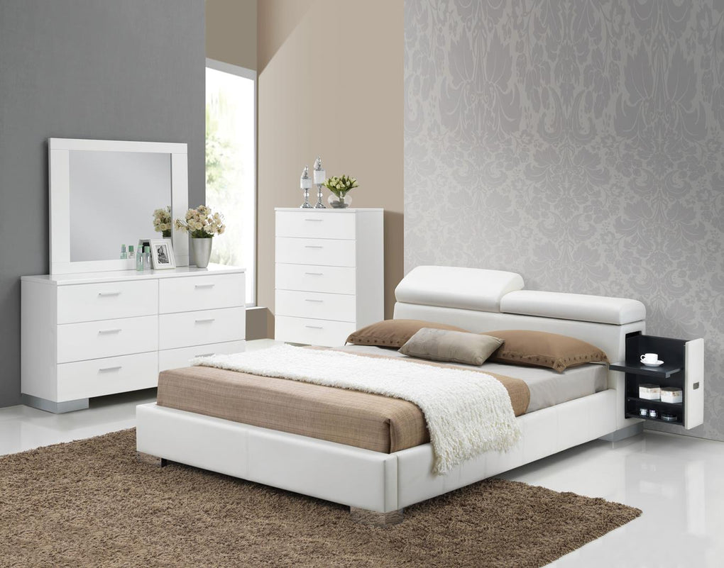 The Manjot upholstered bed will add a sophisticated center piece to your contemporary master bedroom. It's fully covered in a lovely textural white faux leather, features adjustable headrest, and two built-in storage compartments with drop tray. Add this bed to your home to create a calming and inviting bedroom with lots of style. T
