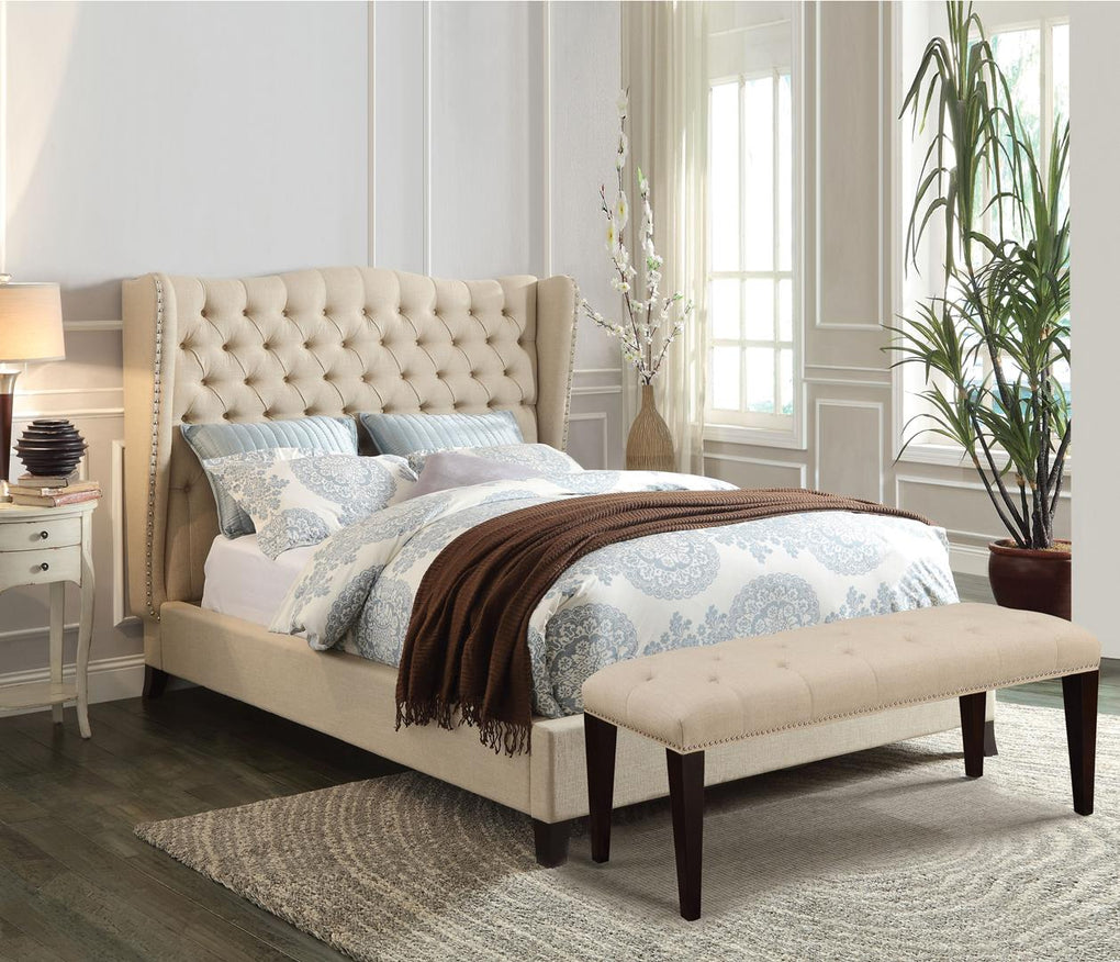 The Faye collection combines traditional elements with modern design. features button tufted headboard with beige linen fabric. It's wingback headboard design and espresso tapered leg creates a luxurious atmosphere to fit any decorations. Matching Bench Sold separately.