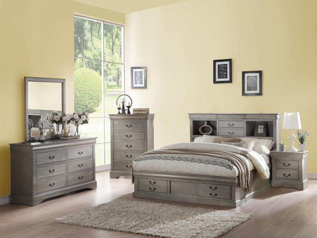 The Louis Philippe III storage bedroom collection features storage bed, headboard with hidden drawers, carefully crafted with selected wood and veneers and complemented by brushed nickel hardware. This collection will make the perfect companion for your favorite bedroom style with 4 different color options in cherry, white, black and antique gray.