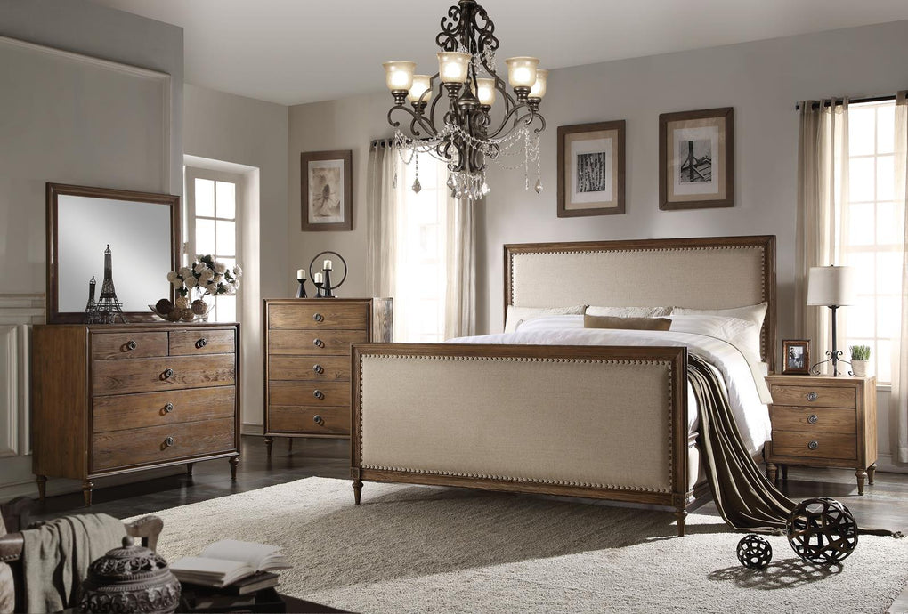 Inverness bedroom set will bring you back to 8th-century French furnishings environment, and crafted in rectangular shape for the whole collection. Upholstered in beige linen headboard and footboard associating with Nailheaded trim, it is a challenge in traditional design to achieve fresh and creative taste. Two optional choices on footboard design will make you more convenient to decorate your master room.