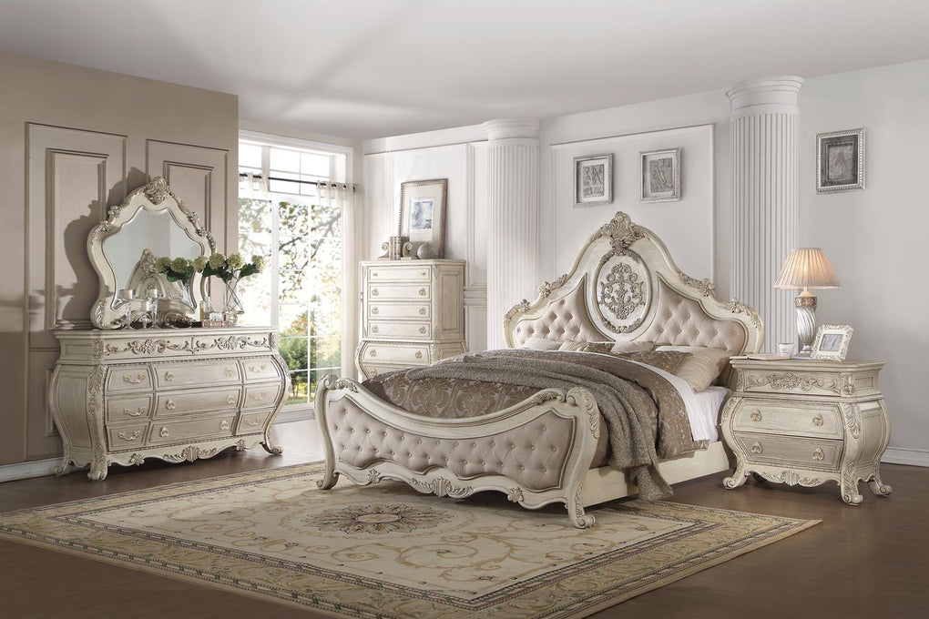 The Ragenardus collection harmonizes traditional details with functional design to accommodate today's styles. This bedroom collection features vintage white veneers, curved panel HB, button tufted headboard/footboard, crown & raised scrolled work ornamental trim and hand-carved style wood drawer overlays throughout all case pieces. The ample storage case pieces, beveled mirror, top Felt-Lined drawers, and metal glide make this set truly elegant and will be a great addition to your home.