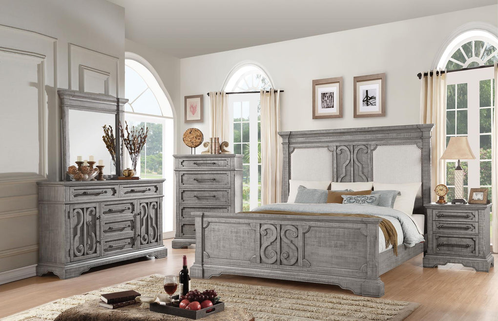 This Artesia contemporary panel bed features a fabric padded headboard with low profile footboard in a salvaged natural wood finish. Crafted with a transitional look that is an ideal addition to any bedroom, the headboard and footboard are accented with raised and scrolled motifs. This fashionable bed will fuse with the surrounding Decor and transform a room from ordinary into something interesting and sophisticated.