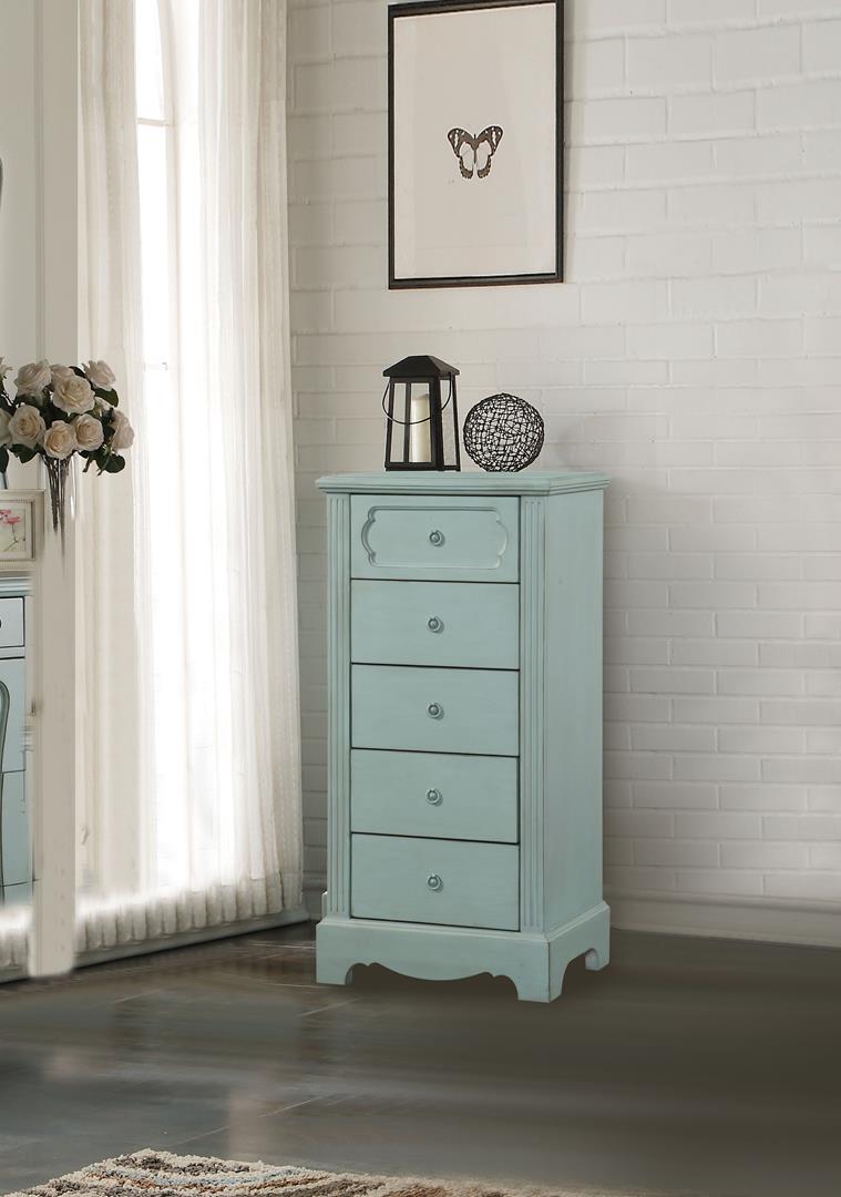 The Morre chest offers an elegant and romantic design for your bedroom. This antique teal chest features five drawers with full extending side metal glides, dovetail English front and back, and grooved side panels. Add this sleek chest to complete your bedroom.