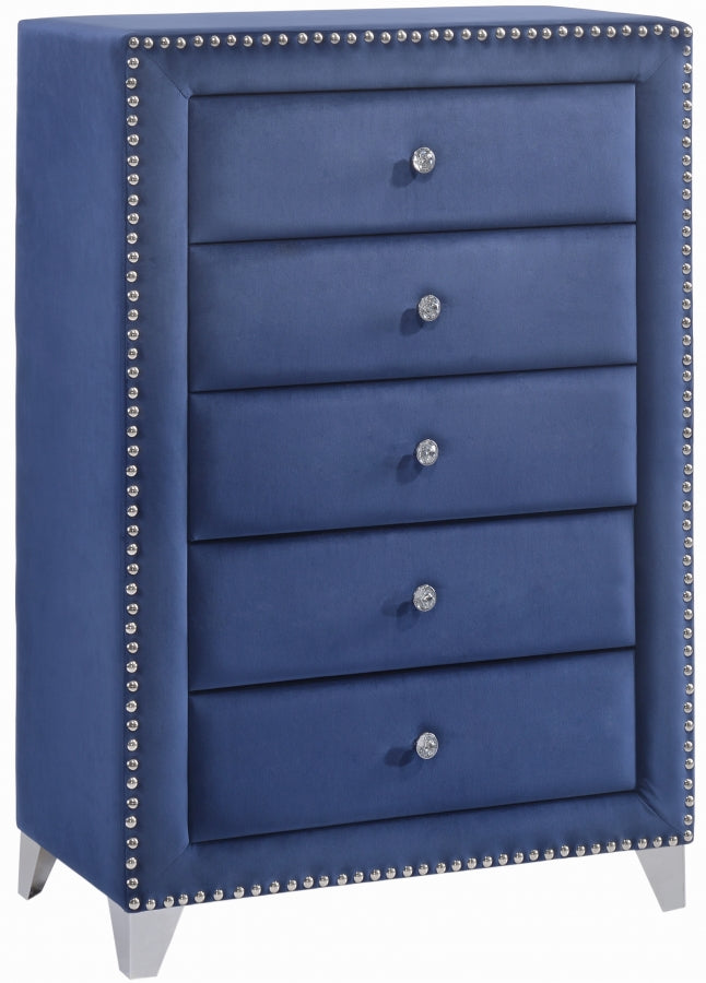 The Caroline Bedroom Set, By Meridian Furniture. This beautiful bed features a custom design upholstered in a beautiful velvet fabric. Garnished with crystal tufting and a nail head trim, this bedroom set is guaranteed to make you feel like royalty.