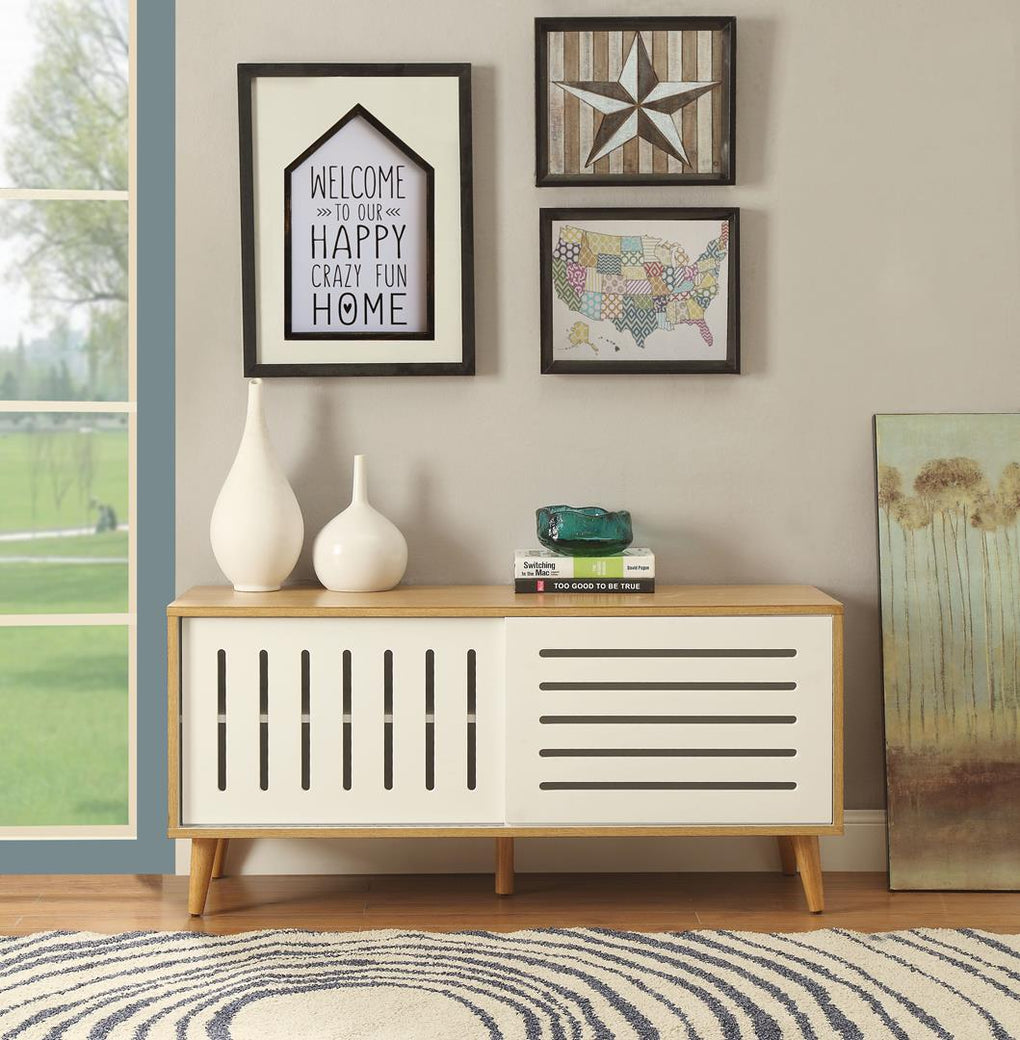 Bring home with you this simple, beautiful and elegant Kollia console table. It is made in a Mid-Century style and versatile in any modern or classical interior. This rectangular console table has natural & white finish with 2 wooden sliding front doors in white with a Diamond Grid Pattern, 1 adjustable shelf inside and wooden tapered legs to support. This console table will give your living room a new look.