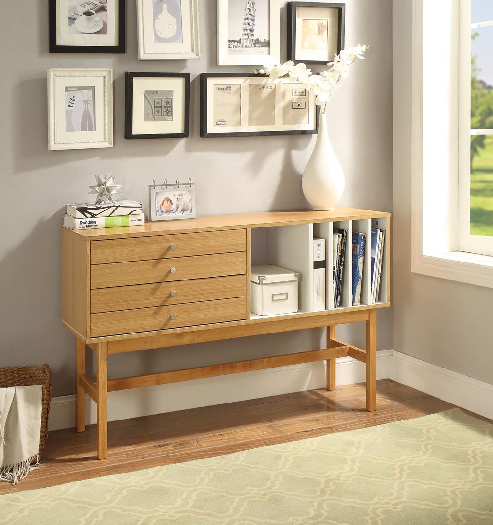 The gorgeous Rectangular Stania console table demonstrates style with a contemporary design. This table features 5 Open Compartments & 4 drawers, wooden square-straight legs & crossbar support in natural finish. Add this console table to any room in your home and you are sure to turn heads with its elegant style.