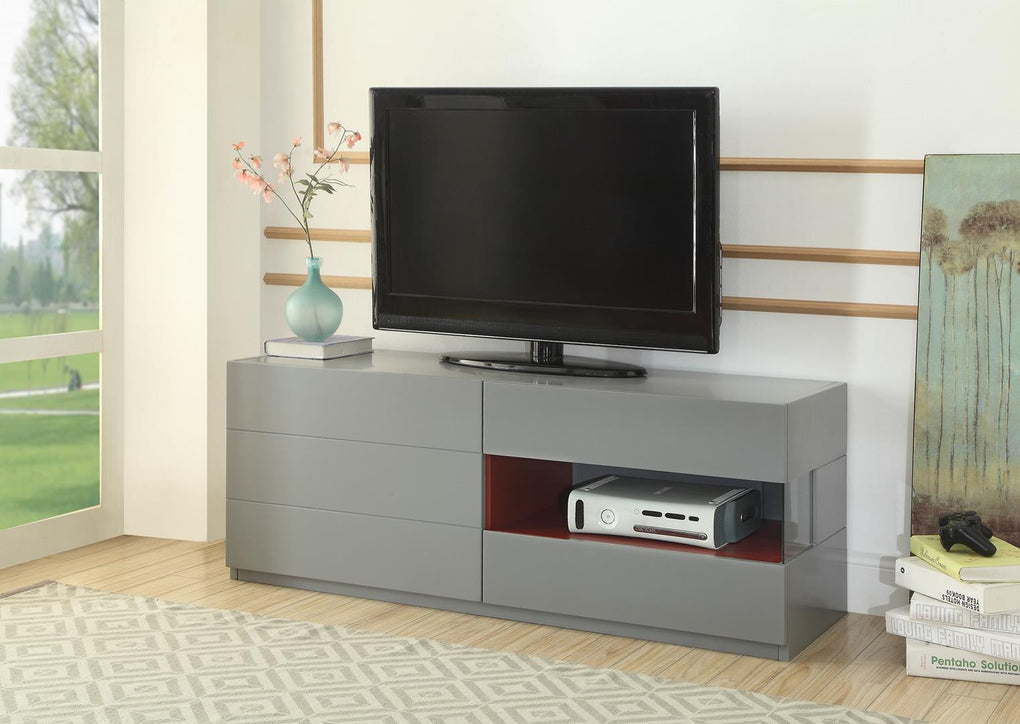 The gorgeous Isaura Rectangular console table in gray finish demonstrates style with a contemporary design. This table features 1 Open Compartment, side glass panel & 2 drawers & Grooved Front Door with 1 Shelf Inside. Add this console table to any room in your home and you are sure to turn heads with its elegant style.