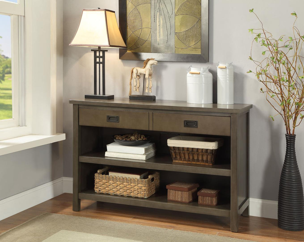 The gorgeous Asteris Rectangular console table in gray-oak finish demonstrates style with a transitional design. This table features 2 Open Compartment, & 1 drawer. Add this console table to any room in your home and you are sure to turn heads with its elegant style.