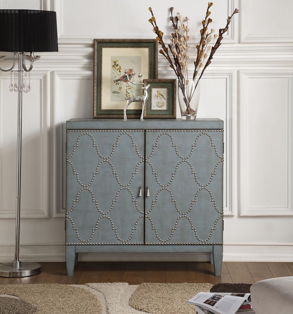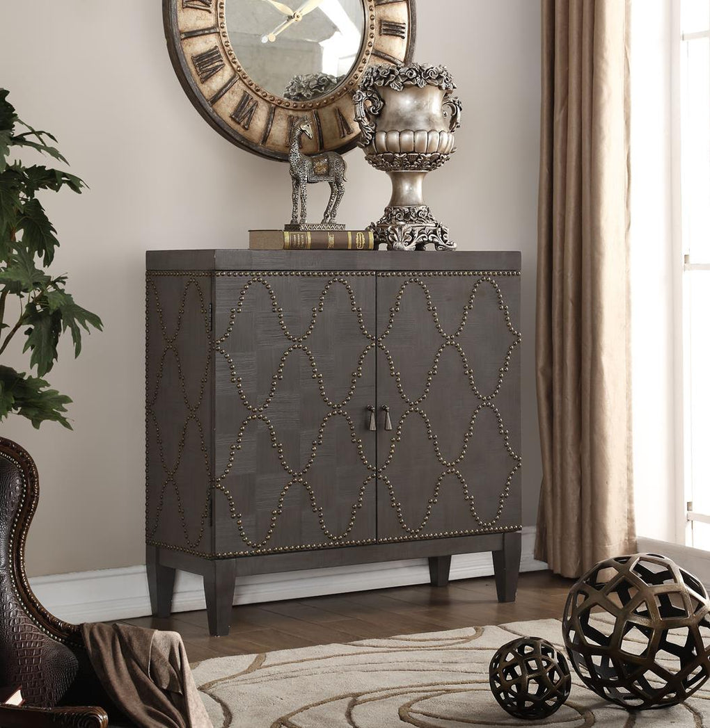 A stylish look for any room in your home, the Cherie console is an easy addition. The console has a nice, antique black finish and comes with 2 wooden doors with Nailhead pattern with 1 Shelf Inside. The drawers help to tame the clutter, while the shelf helps provide additional storage and decor solutions.