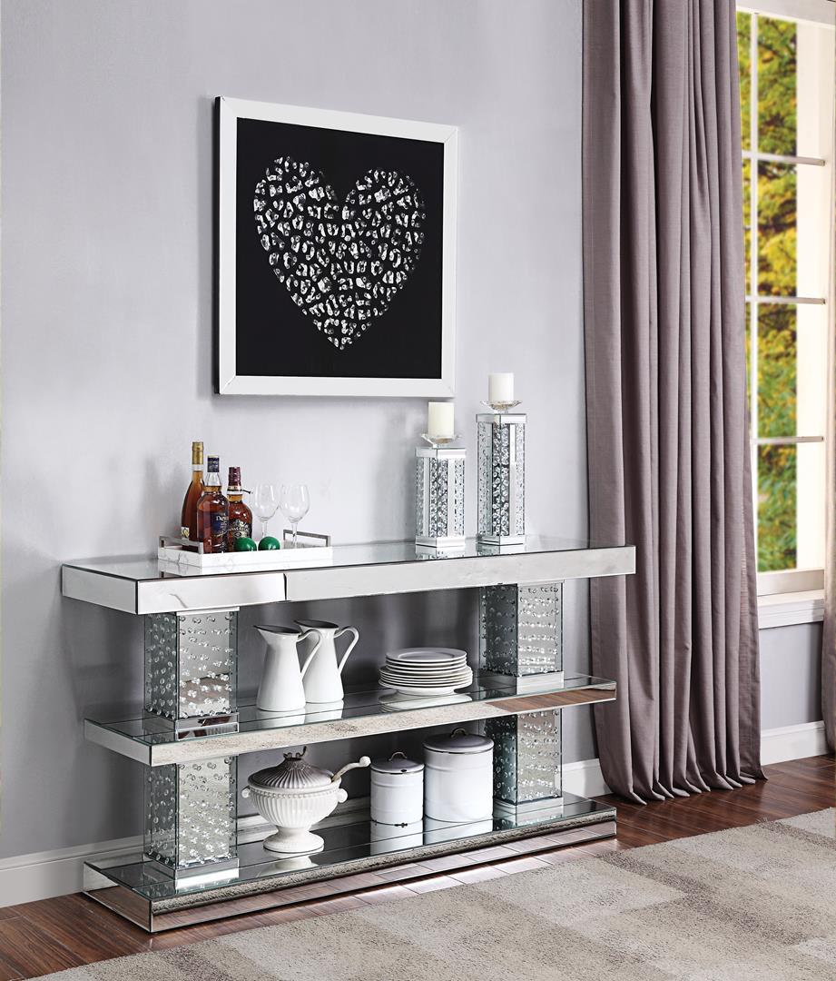 The Nysa Console Table will add a contemporary touch to any room in your home. With its clean lines, this brilliant square occasional table showcases a distinctive style for an intriguing look. The three-tier table features tempered glass and a fully mirrored base and tabletop. With a unique stacked design and columns trimmed with a spectacular faux crystals inlay, this unique accent piece complements a wide range of Decor. Its modern design is a useful addition to any living area.